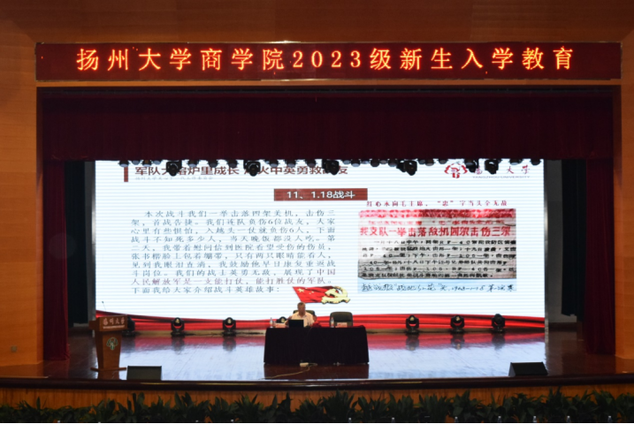 为引导我院学子走近老兵故事,感悟革命精神,厚植爱党爱国情怀,9月24日晚,商学院在扬子津校区文体馆三楼报告厅开展“军队大熔炉里成长,炮火中英勇救战友”主题讲座,本次讲座由关工委刘方云老师主讲,商学院辅导员丁星桐主持,全体2023级新生参与。
