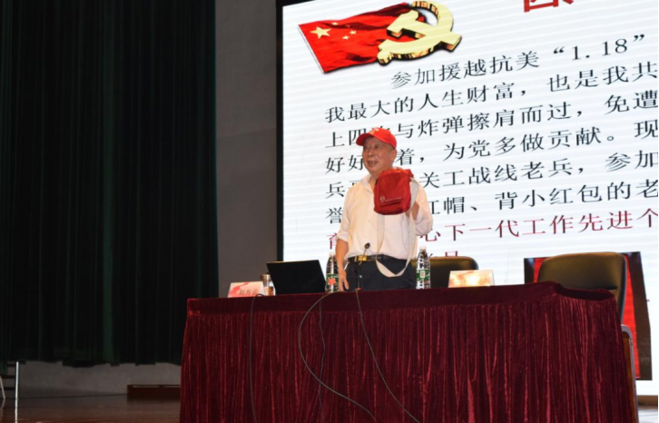 随后,刘方云老师介绍了他退休后的经历。在扬州大学退休后,刘方云老师不忘初心,依旧在关工委的讲台上发光发热,奔波于扬州大学的各个学院和校区,完成了百余场红色宣讲。又因为头戴红帽,身背红包的标志性穿着,被同学们亲切的称呼为“小红帽爷爷”。
