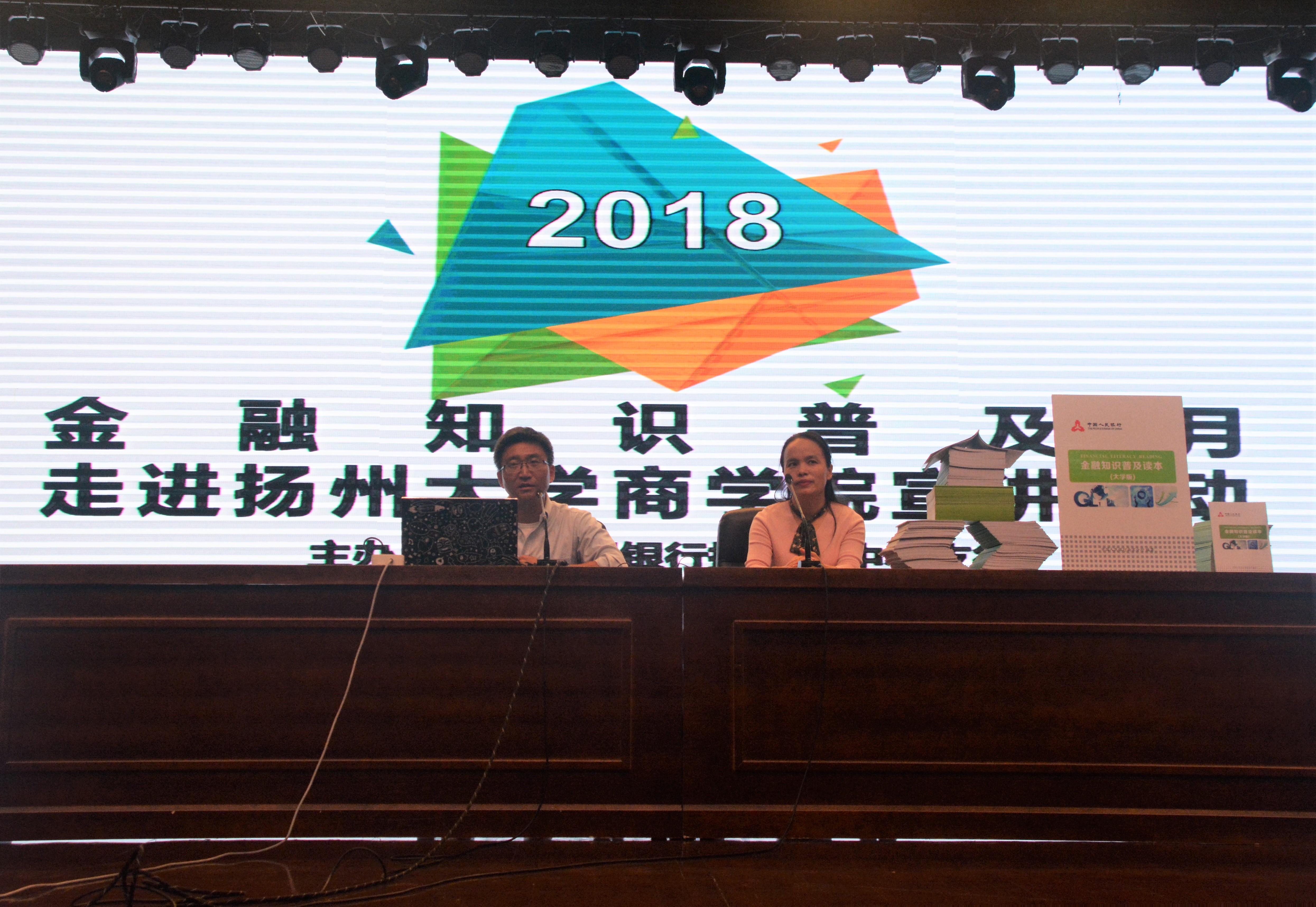 9月29日晚六点半商学院2018级新生入学教育专题报告于文体馆召开。该报告由中国人民银行扬州市中心支行办公室副主任朱苏世先生、中国建设银行扬州分行网金部产品经理卞美娟女士及扬州大学商学院杨林老师、魏清老师、刘映朕老师出席。