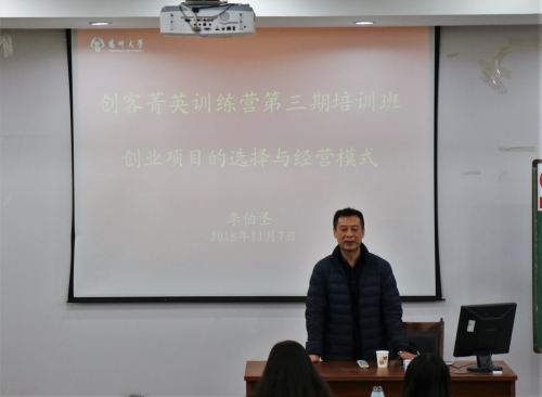 财务管理专业的李伯圣教授向同学们介绍了创业项目的选择与经营模式。李教授尤其强调了经营模式的重要性,他说:“没有独特的技术,也要有独特的营销方式。”并举了很多生动形象、简单易懂的例子,令同学们受益匪浅。