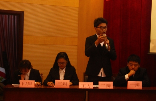 晚六点半,辩论赛正式拉开帷幕。主持人先介绍了进入决赛的两支辩论队以及到场的评委,随后激烈的辩论赛正式开始。正方是以“成年人的世界更无情”为辩题的公管1801代表队,而反方是工以“小孩子的世界更无情”为辩题的工商1803代表队。首先由双方一辩发言表明立场,然后是双方二辩、三辩分别进行驳立论和质辩,接下来是最为激烈的自由辩论环节,博得现场观众阵阵掌声,最后由双方四辩对各自的观点进行总结。在这精彩的辩论之后,评委对该场辩论进行点评和打分。最终,公管1801班以80.8分获得冠军,工商1803班以79.6分获得亚军,金融1802班获得季军。决赛过后,继续开展了以“信仰是否为人类的必需品”为辩题的表演赛,双方辩手妙语连珠,现场气氛高涨,迎来又一个高潮。