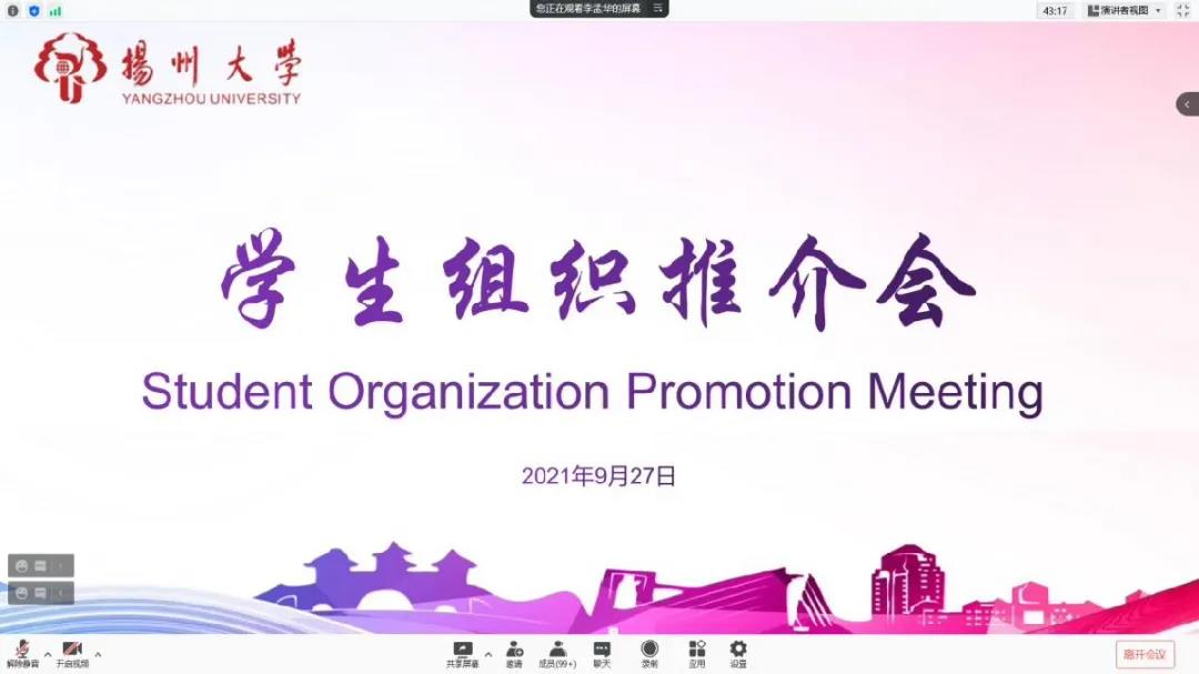 为院学生组织面向新生招取新成员,院团委支部于9月27日下午2:00,在腾讯会议上成功举行了学生组织招新推介会。此次会议由李孟华老师担任主持人,商学院21届全体新生以及各学生组织代表均参与。