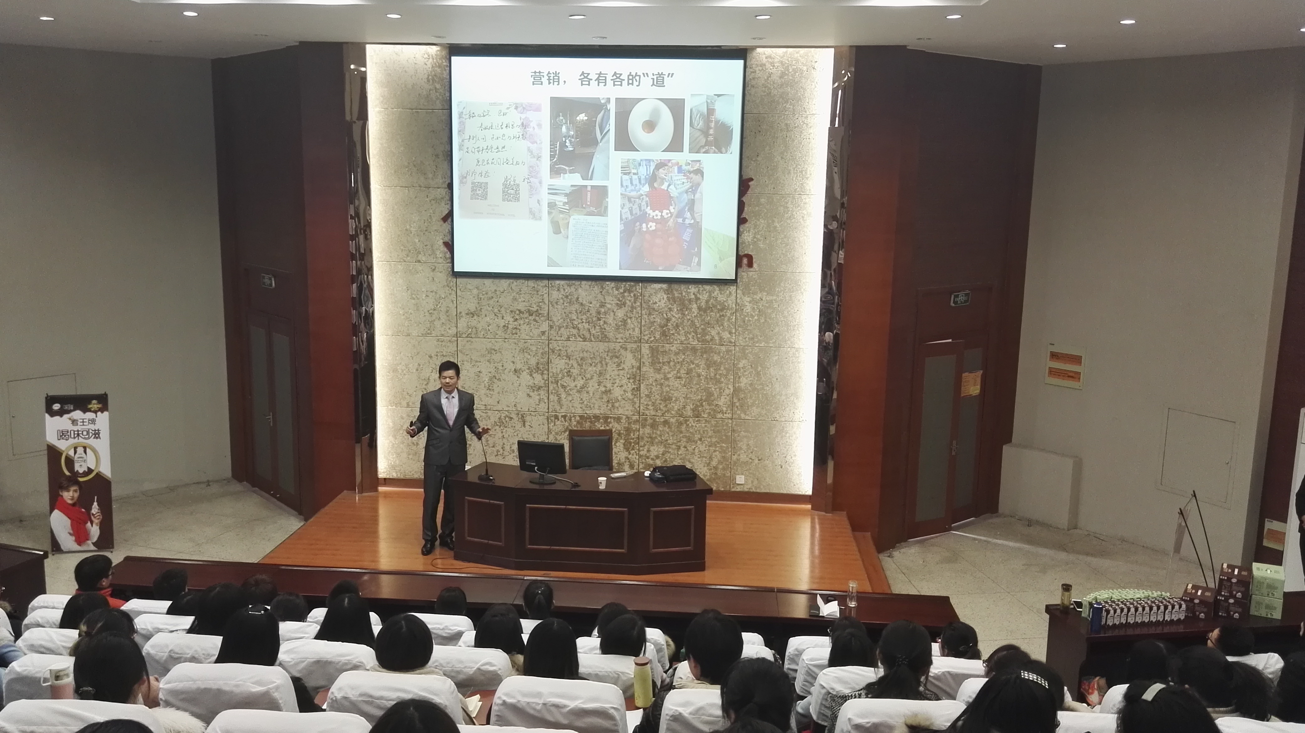 王成海先生在报告中,首先结合自身在生活中观察到的企业营销点滴现象,感悟“营销,各有各的道”,强调同学们在学习和生活中要对不同行业、不同市场、不同品类的营销多思考多领悟。接着他从快消品的概念、基本特性及发展趋势、快消品市场竞争态势、快消品分销渠道建设与管理、快消品促销等方面,结合伊利、康师傅等企业的鲜活案例,分享了他从事快消品营销近二十年的心得与经验;并着重从定位理论角度分析了快消品品牌建设的法则与步骤;然后王成海校友以其自身成长经历为例,与我院学生分享了他个人职业成长的经验,提出了营销人才的职业要求,强调了在大学与未来职场中要始终坚持不断地学习思考、尤其是要多读书、努力提升自己的综合素养及能力、培育乐于奉献精神的重要性,阐述了其职场理念与职场生存法则及技巧,强调“人生是一场生命的积分”,鼓励同学们要乐观,要坚持努力,因为“每个路人甲,都可以成为闪耀的明星”。最后,王成海先生介绍了伊利集团与在校学生的合作方式与营销人力资源招聘要求等情况。