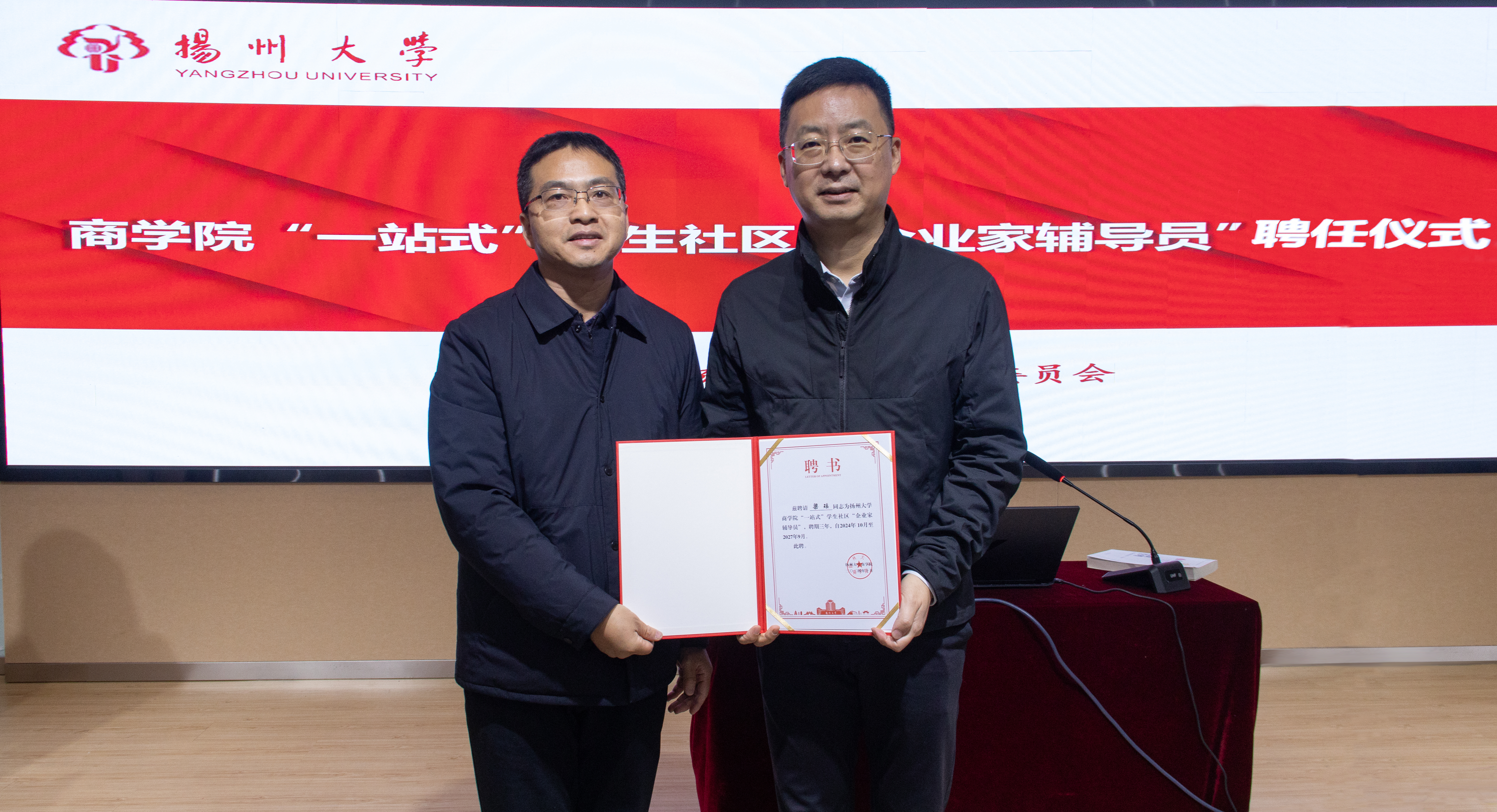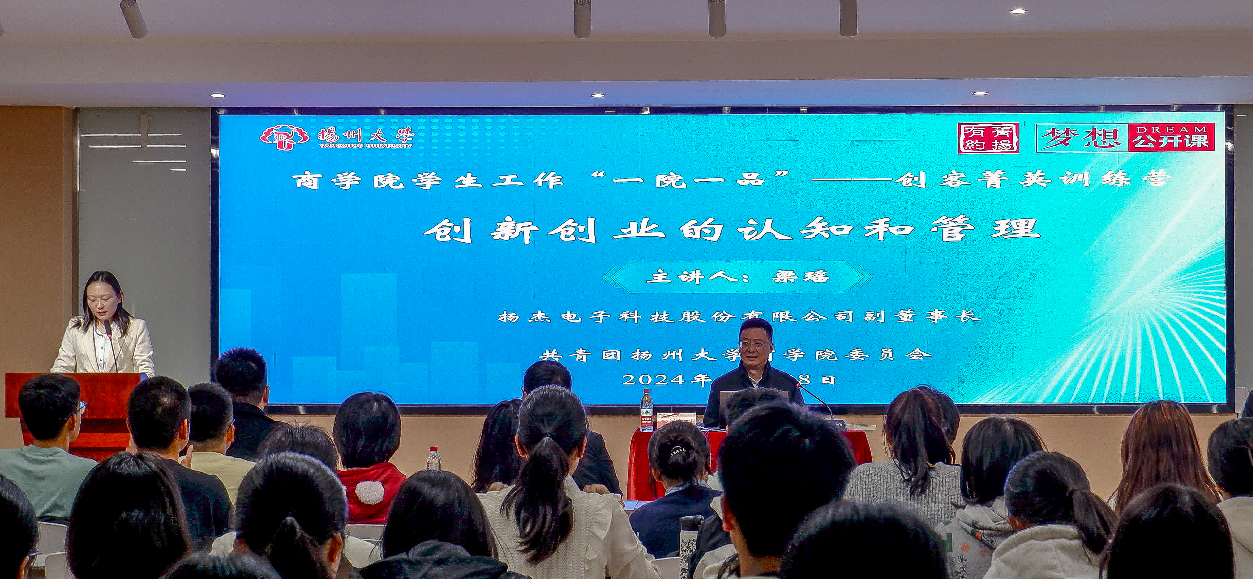 为弘扬企业家精神,培养商院学子的创新精神和实践能力,塑造其对生涯发展道路的清晰认知,扬州大学商学院于10月28日晚18:30在一楼报告厅开展第17期创客菁英训练营第一讲,本次活动邀请扬州大学优秀校友、扬杰电子科技股份有限公司副董事长梁瑶校友作为主讲嘉宾。商学院党委副书记姚丰华、院团委(学工办)辛肇镇、创客菁英训练营全体营员参加活动,活动由院团委(学工办)书记(主任)王成春主持。