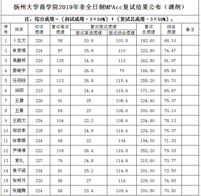 扬州大学商学院2019年非全日制MPAcc复试结果公布(调剂)