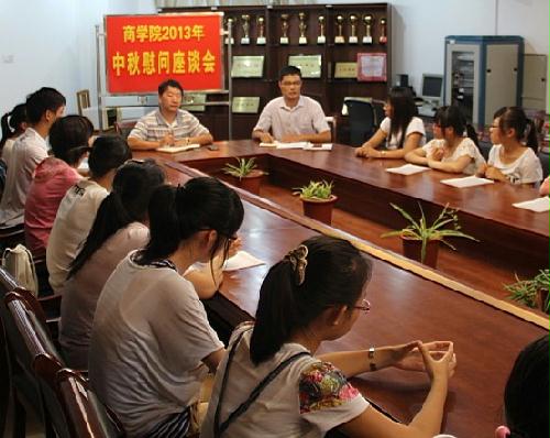 秋风送爽、桂子飘香,在海内外华人翘首企盼一年一度的中秋佳节之时,为让刚刚离家求学的经济困难学生感受到节日的温馨,商学院于9月18日下午在行政楼3楼会议室召开困难学生中秋慰问座谈会。院党委副书记孟益宏、团委书记廖善光、学工办老师及2013级困难学生代表参加了座谈会。