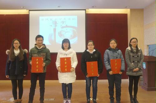 11月29日,我院第三届汉字听写大赛决赛圆满落幕。在当天的比赛中,参赛选手分两轮展开角逐。第一轮为字谜竞猜;第二轮为考察偏旁认知能力。赛况异常激烈,14支队伍展开激烈角逐,最终出现了4队平分的局面。经过加时赛, “采雅”队和“挥斥方遒”队获一等奖;“高矮胖瘦”队、“肯定”队等获二等奖;“不靠谱儿”队、“一支队伍”队等队获三等奖。