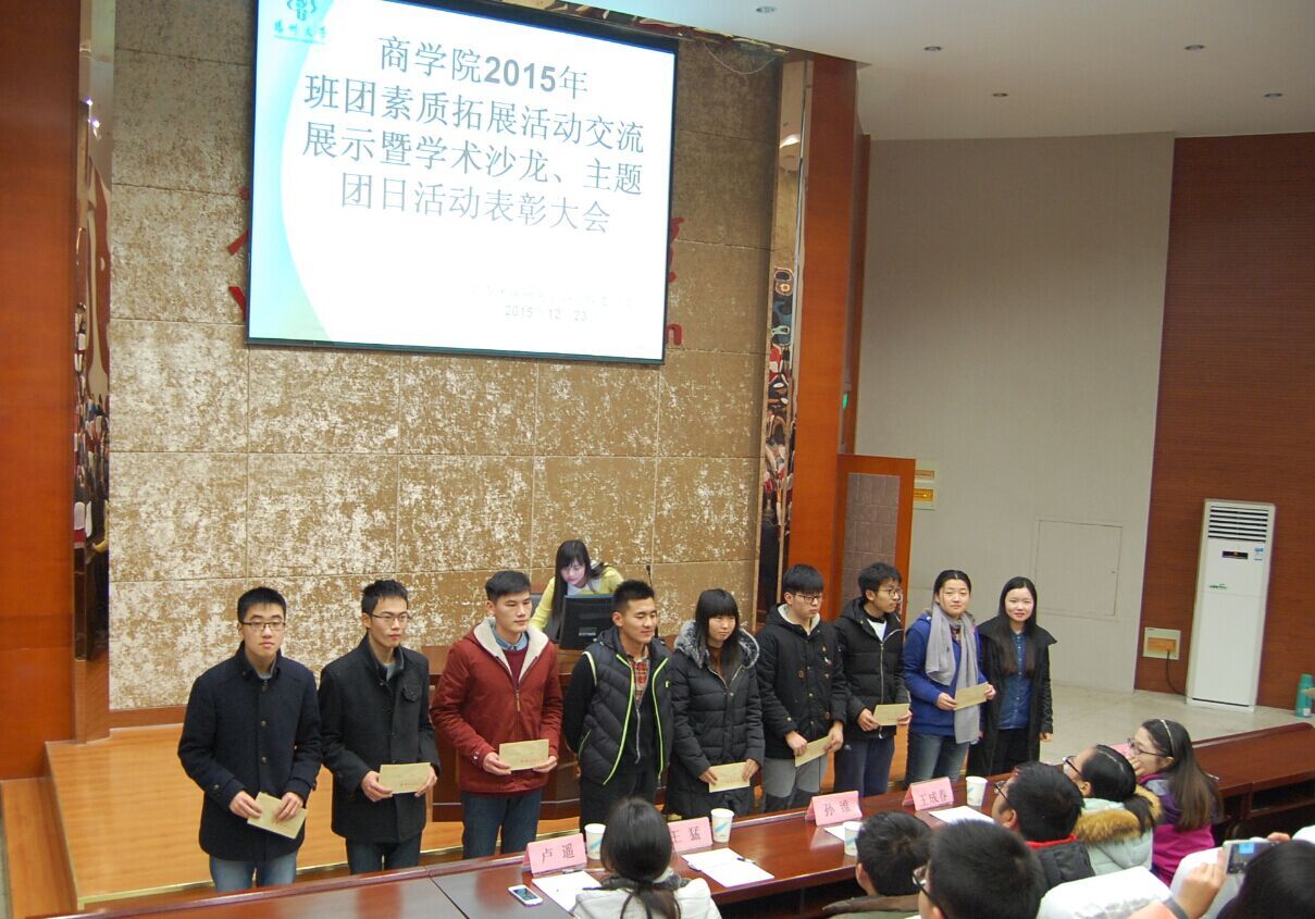 12月23日,我院隆重举行2015年班团素质拓展活动交流展示暨学术沙龙、主题团日活动总结表彰大会。活动首先由主持人宣读学术沙龙和主题团日活动获奖班级名单。随后由优秀班级进行了班团素质拓展活动交流展示。最后,与会老师们向大一新生分享了三条如何办好班团活动的建议:一是跨专业交流,二是注重实践积极参与,人人参加到活动中来,并在活动中获得经验欢乐;三是让老师参与到班团活动建设中来。