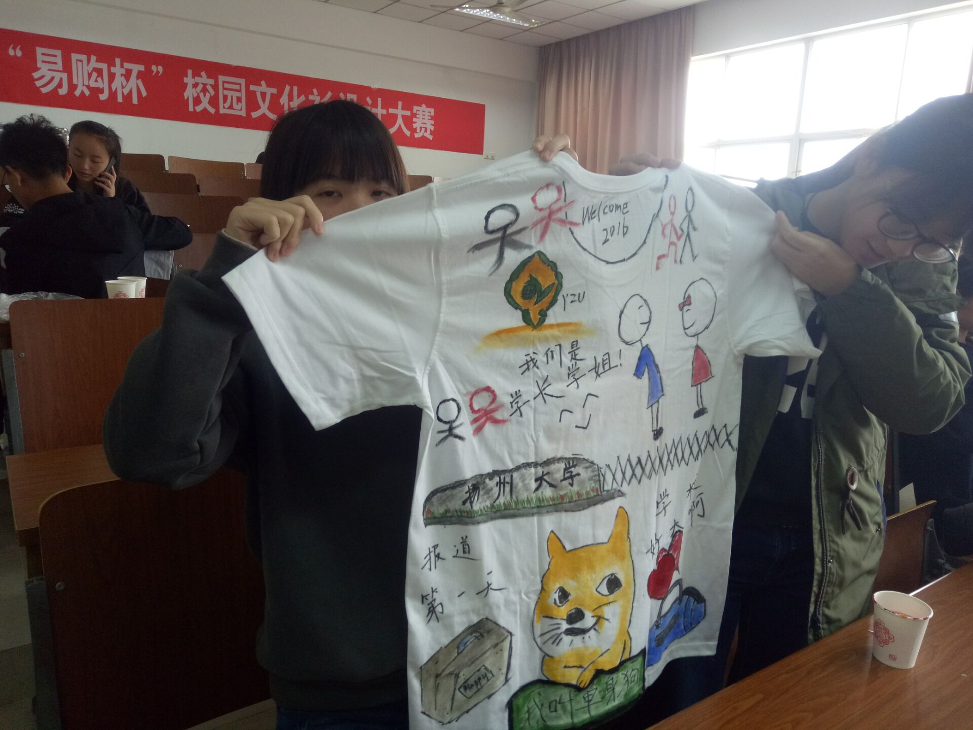 比赛分为现场评分和线上投票两部分。比赛中,选手们以专业知识为背景,运用丰富的想象力,结合社会主义核心价值观,赋予文化衫新的生命。其中,作品《扬大第一印象》以漫画的形式,描绘了新生入学场景,幽默诙谐的绘画风格,令人眼前一亮。最后,徐心怡的作品《我爱电商1601》获得一等奖,田德华、孙雨菲的作品《建工小黄人 》、徐紫荆、王文宣的作品《贵族狗》获得二等奖,王文宣的作品 《扬大第一印象》、 杨迈的作品《衫外山》获得三等奖。
