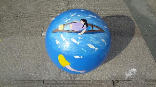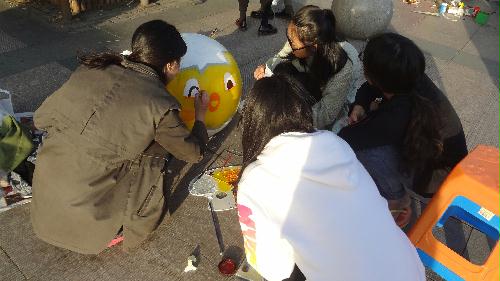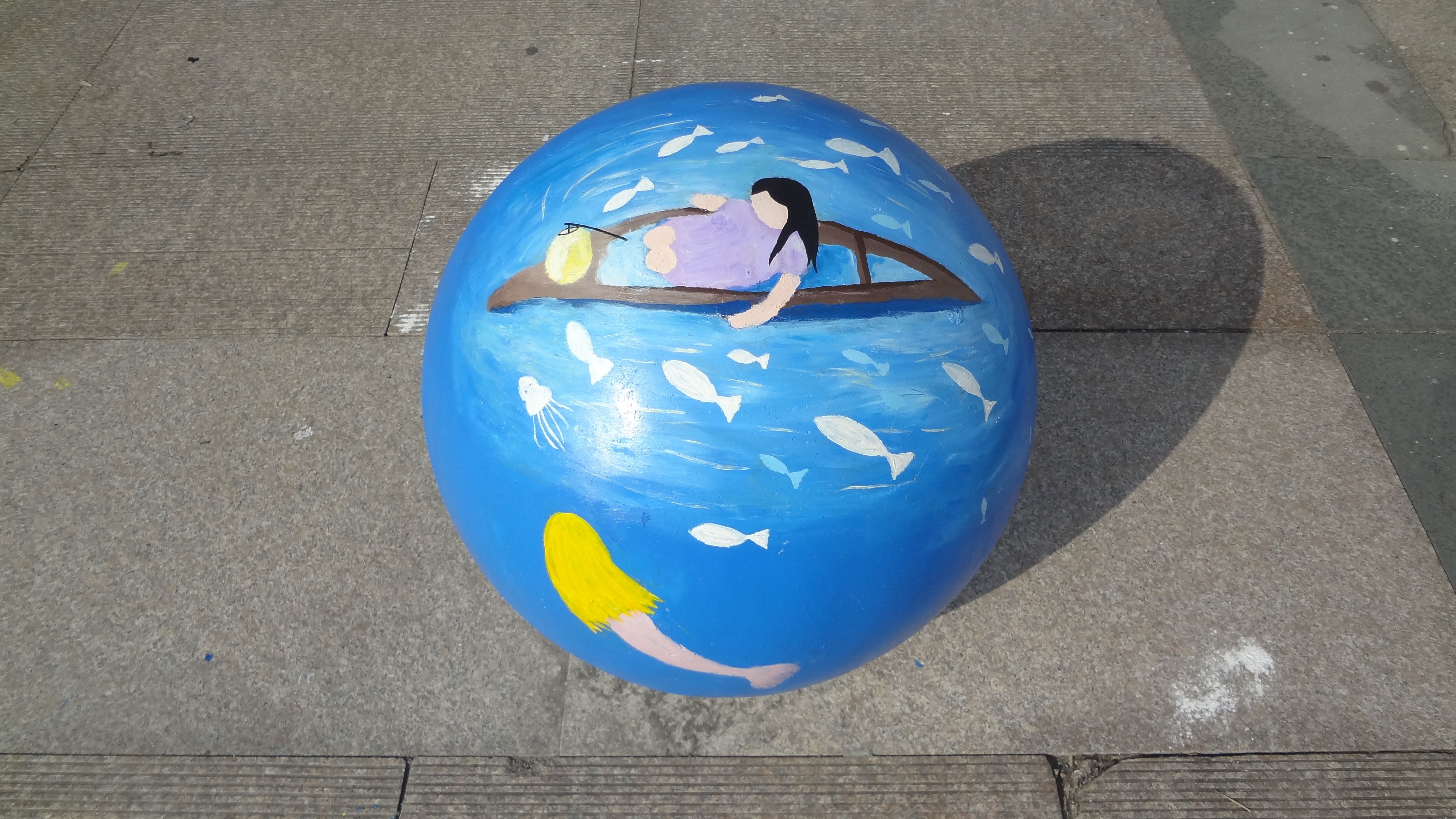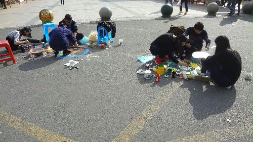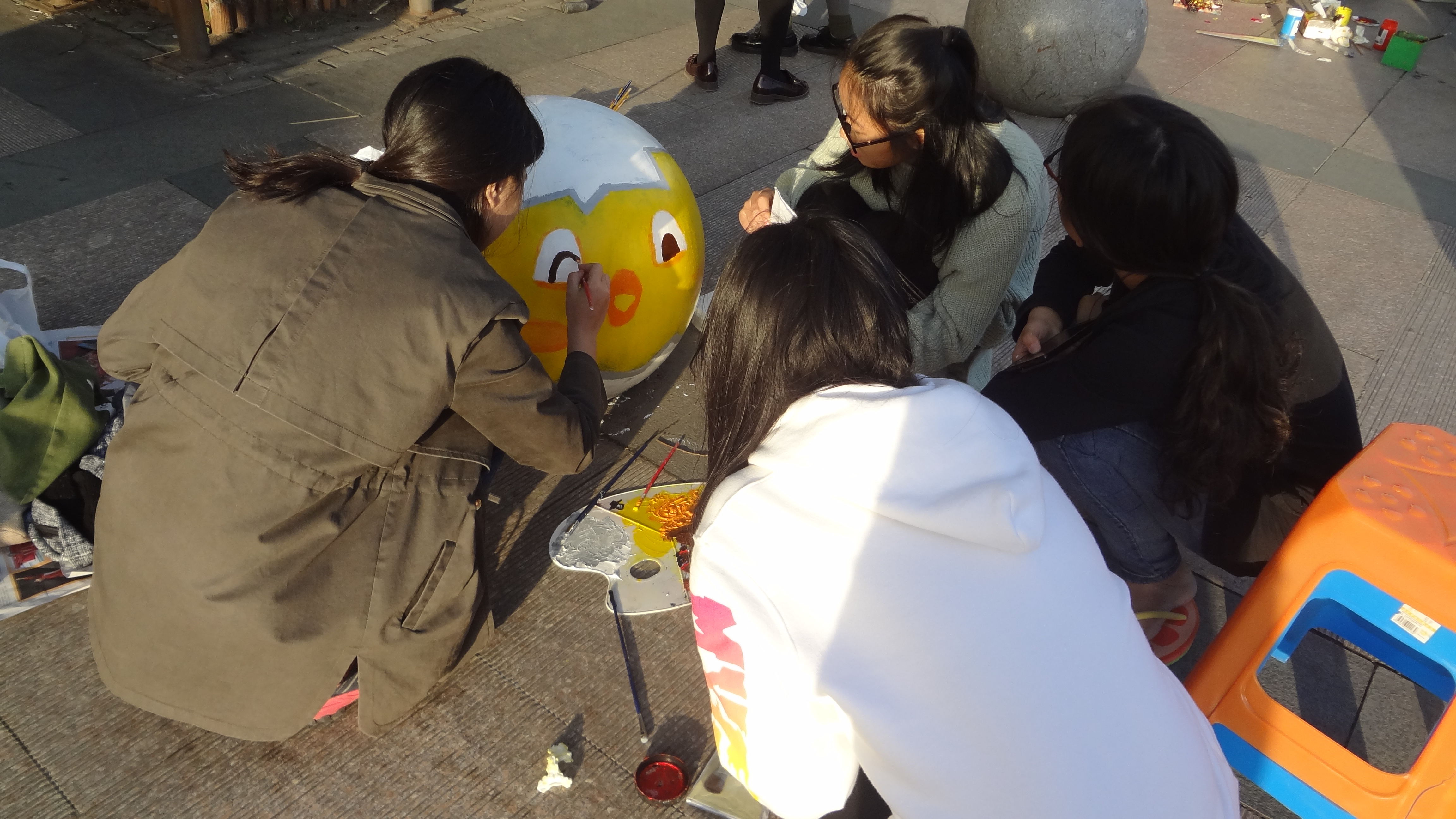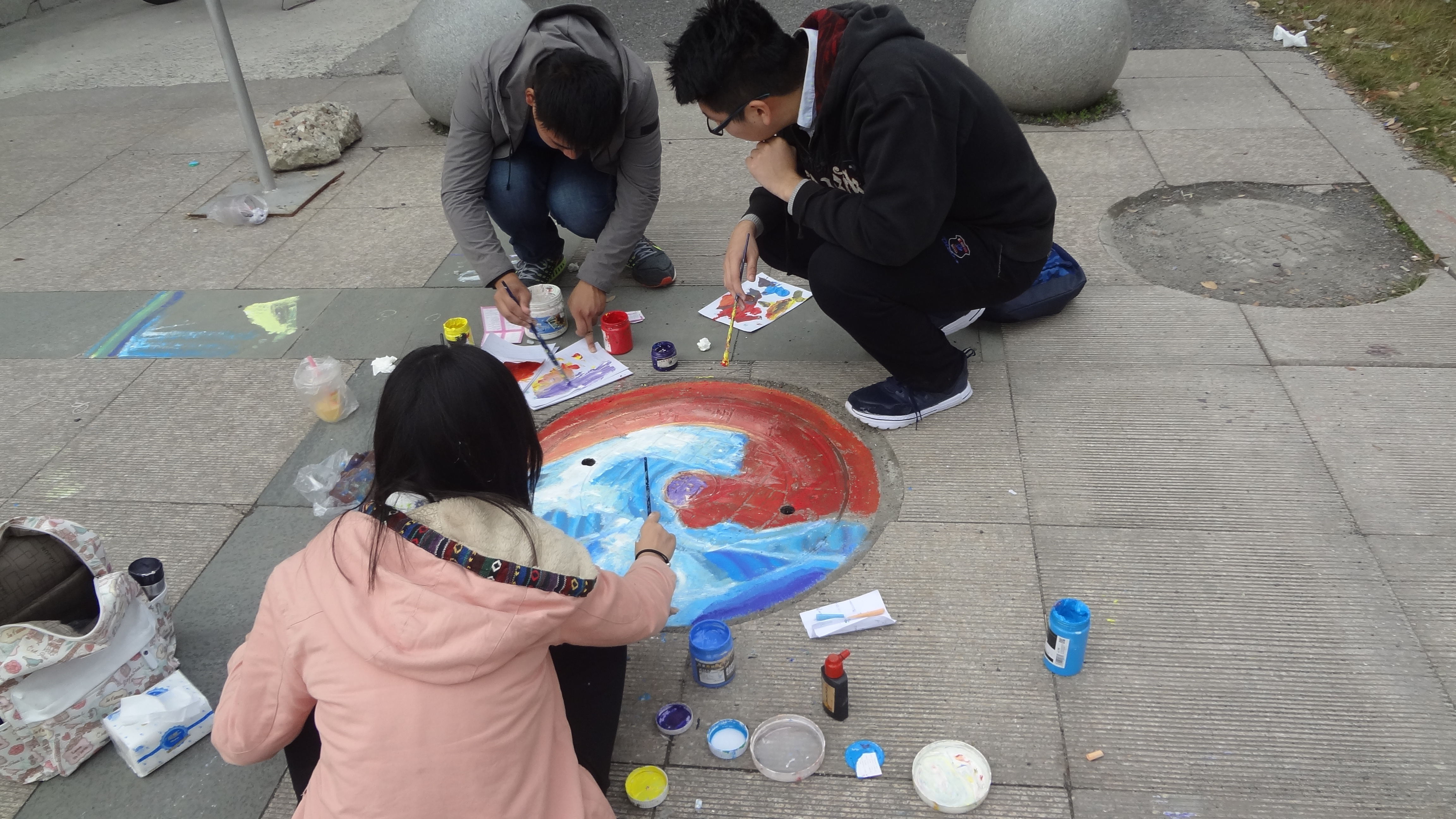 此次活动共分为两个环节。第一环节为小组报名,设计初稿。参赛小组由1~4人组成,选择石球或井盖美化并手绘图纸一张。各小组成员开动大脑,结合石球的立体特点与井盖的平面特点,设计出了一幅幅生动的图画,工作人员根据初稿选出较为优秀的小组。第二环节,入选小组在石球或者是窨井盖上作画。在实地作画过程中,各小组成员分工明确,相互协作,画轮廓、修边、调色、涂色等步骤进行得井井有条,同时,每组配有的宣传部工作人员,负责提供颜料、画笔,清洗画板等工作,为参赛小组提供了贴心周到的后勤服务。在小组成员们专注的绘画、工作人员周到的服务下,一个又一个井盖和石球穿上五彩斑斓的新衣,引来了路过的老师、同学们的驻足观赏和点头称赞。最后,李桢宇、胡颖、周楠、程李琦、龚文琪、徐慧敏、张晨鸿、朱丽等团队成员凭借其出色的团队协作以及杰出的绘画功底获得了此次美化大赛的第一。