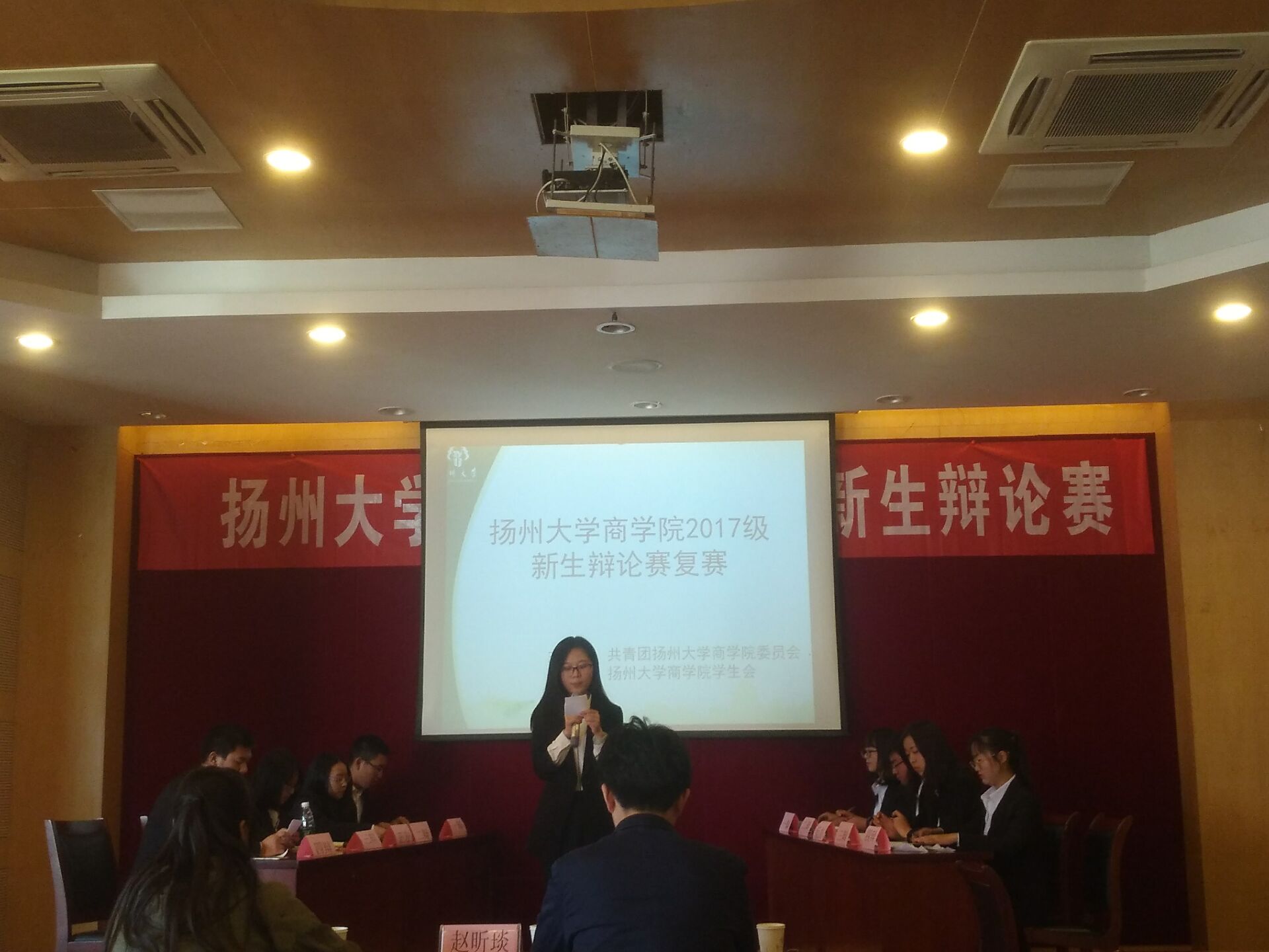凉风习习吹进秋的气息,11月5日,我院在商学院行政楼一楼报告厅隆重举行2017级新生辩论赛复赛,往届优秀辩手朱峻质、赵昕琰和杨思羽担任担本次比赛的评委。