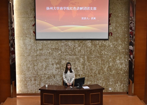 最后,学院特色“红色讲解团团支部”向同学们展示了他们形式多样的活动,如‘线上’宣讲——小红星电台,‘线下’宣讲——扬州‘益课堂’,一带一路主题汇演等。伏爽同学通过介绍这些创新性的活动,使同学们看到了一个切合时代主题的学院特色,同时给同学们提供了利用新媒体技术的独特思路。