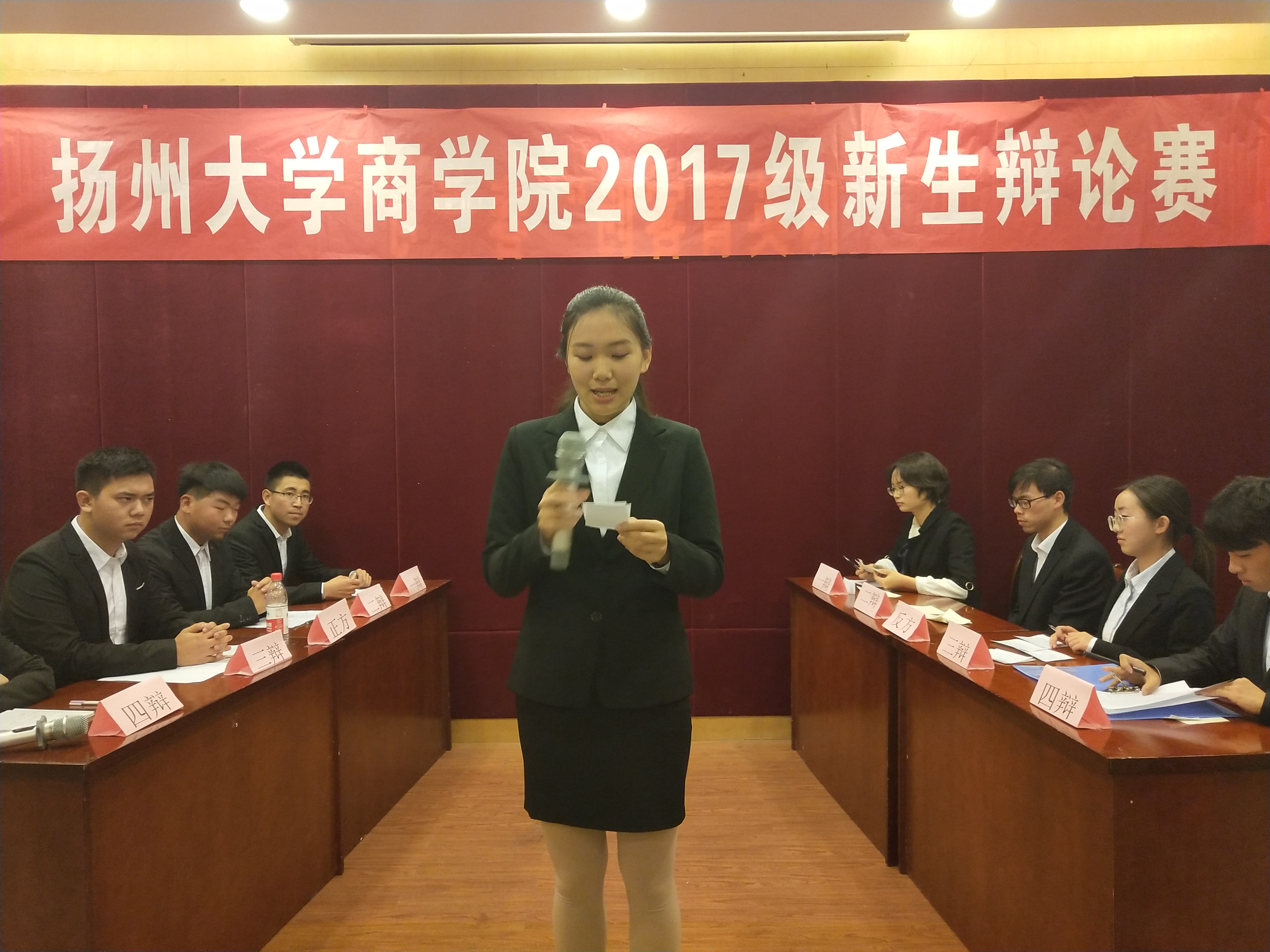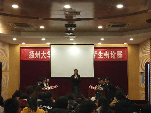 11月20日晚,商学院新生辩论赛决赛在院行政楼报告厅隆重举行。学工五办辅导员刘映朕老师、2015届扬子津校区辩论赛联赛冠军队辩手董蕴怡和顾国蓉担任本次比赛的评委。