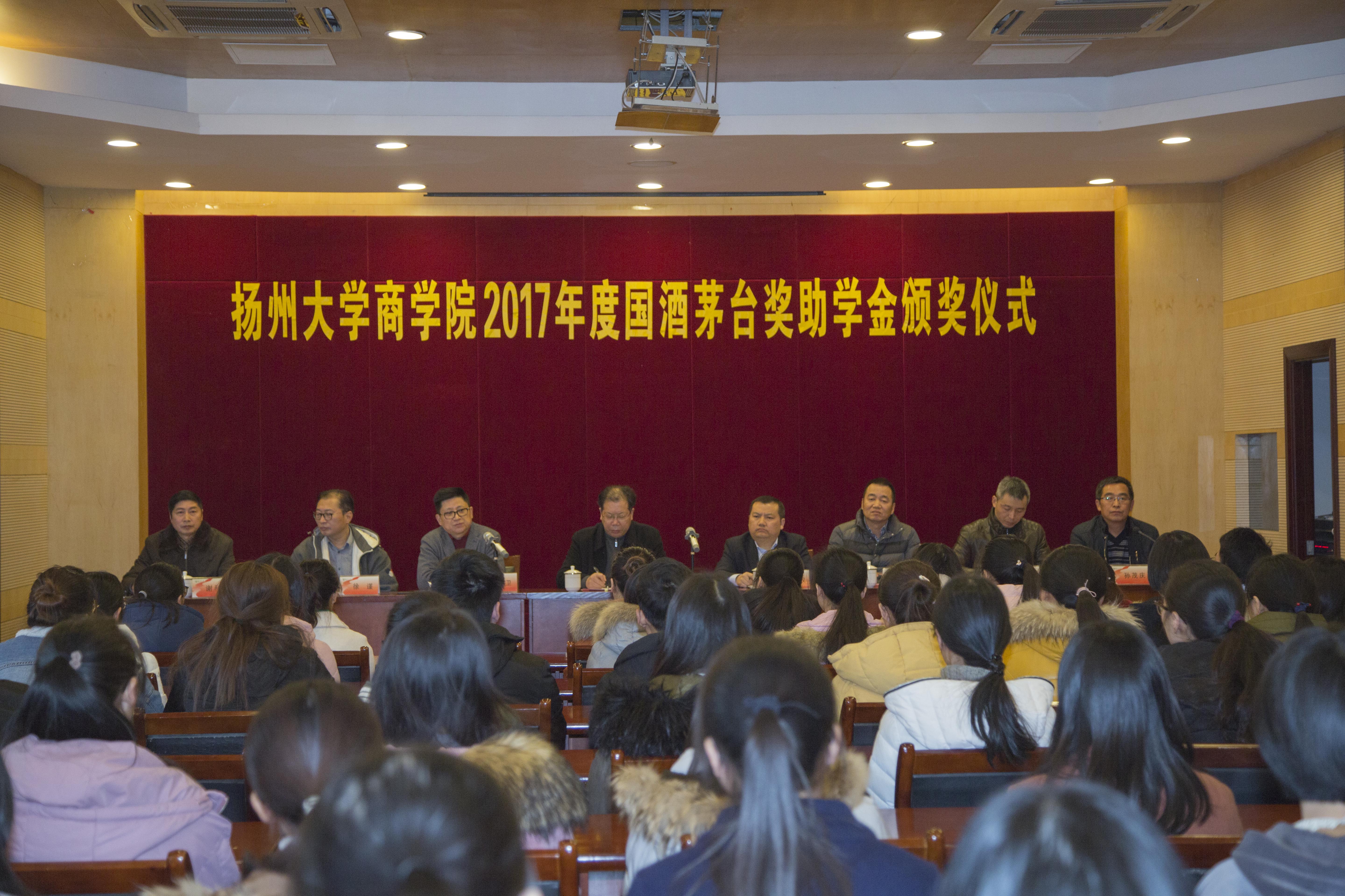 12日下午,商学院茅台奖助学金颁奖典礼在商学院行政楼报告厅举行。本次颁奖仪式莅临的嘉宾有:扬州大学党委书记姚冠新,国酒茅台江苏省区经理杨秀权,江苏中糖德和经贸有限公司董事长张卫、总经理李朝阳,扬州风正经贸有限公司总经理徐瑾,校对外联络办副主任王志健,扬州大学商学院党委书记谢科进。本次仪式由院党委副书记孙茂庆主持。