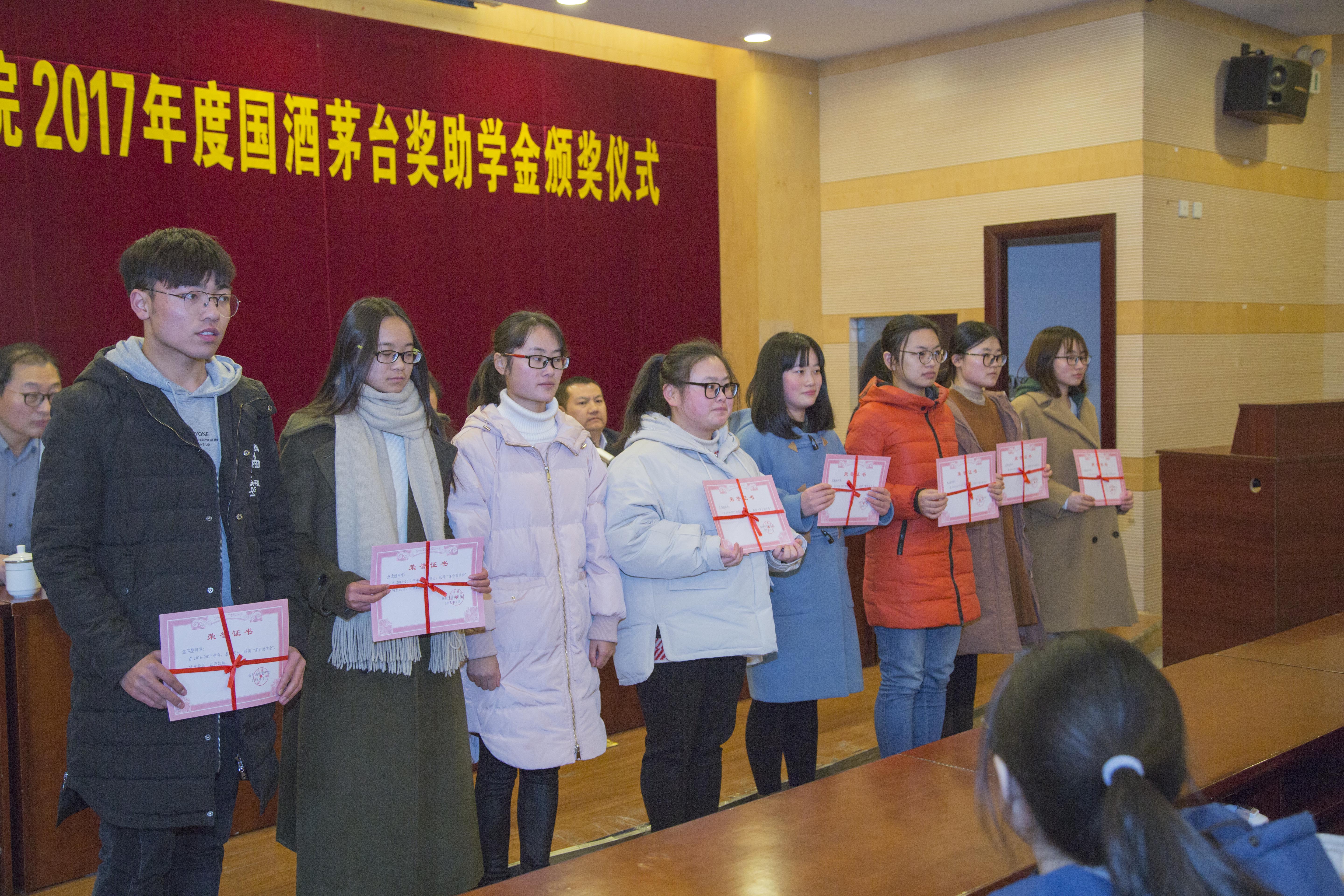 江苏中糖德和经贸有限公司董事长张卫先生从自身实际以及国酒茅台的发展历程出发,告诫在场的获奖同学们要有四颗心:一是感恩的心——感恩是一种品德,会让人走的更长远,感恩之心需深入骨髓与言行。二是责任心——责任心是工作有所成就、事业成功的基石,需常怀责任心,将使命与担当感放在身上。三是匠人匠心——匠人匠心是产品品质保证的重要方面,是公司经久不衰的重要原因,做人需怀有工匠精神与敬畏之心。四是坚持坚守——坚持坚守是个人品质的考验,未来遇到挫折和挑战,坚信只要坚持便会有回报。国酒茅台江苏省区经理杨秀权先生通过介绍国酒茅台的地位、国酒茅台希望工程的建立历程,告诉在场的获奖同学们:国酒茅台的资助对象千千万万,扬大的学子们只是中国各地受资助者的一个缩影,以此映射国酒茅台的重大作用。同时,杨秀权先生给在场同学们提出一点期望,要将中国梦与个人梦想结合起来;要担历史之重任,从自身做起,自强不息,自信自立;要感恩社会,在力所能及的范围内与国酒茅台一起将爱心传递下去。