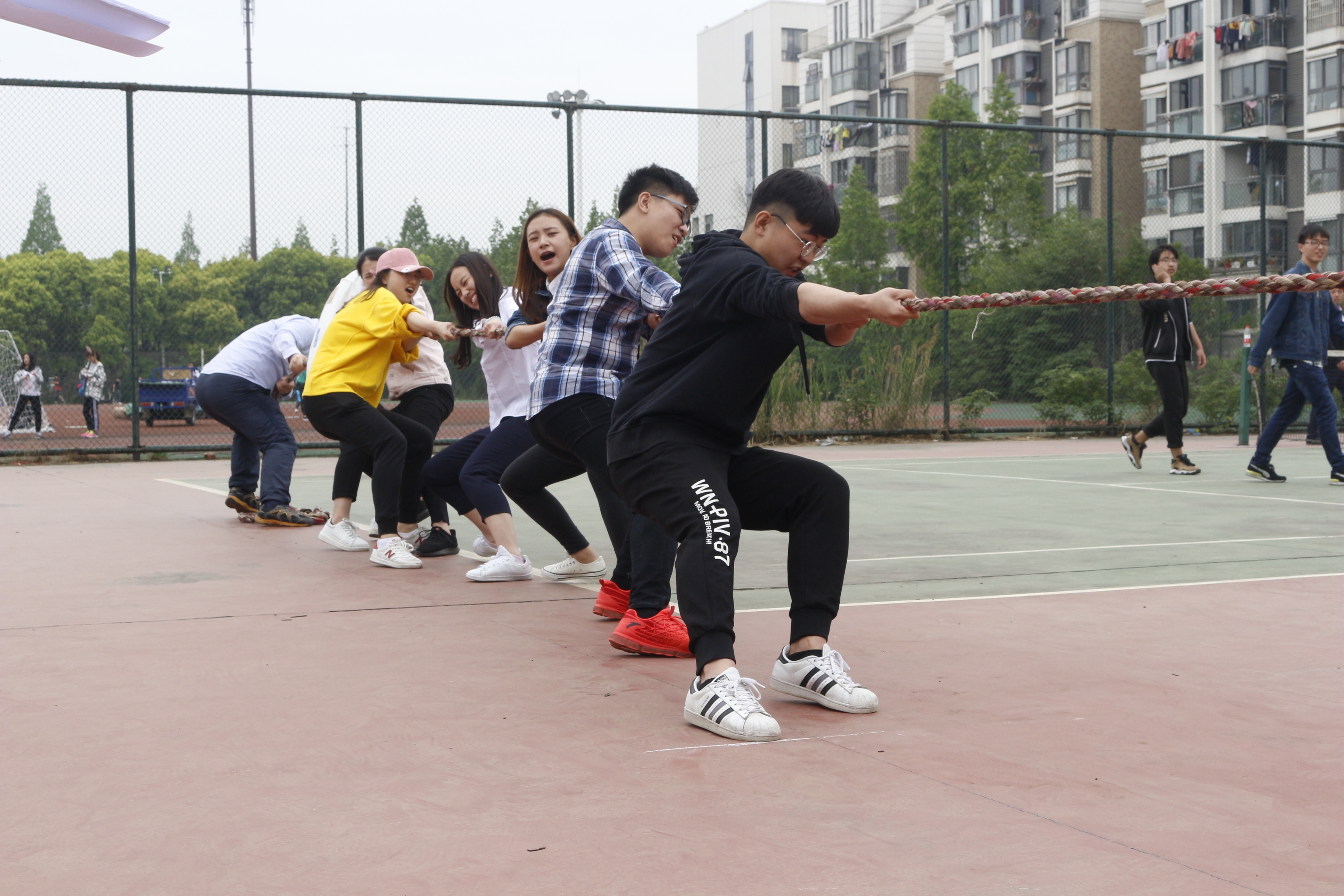师生趣味运动会:以班级为单位参加的拔河比赛项目,气氛热烈,各班班主任与学生们团结一致,心往一处想,劲往一处使,充分体现了师生间的良好互动关系。此外,工作人员忙碌的身影随处可见,整个比赛过程井然有序。比赛中途短暂的雨并没有浇灭大家的热情,所有的运动员坚持拼搏,打动了所有观看同学的心,为运动会添上一抹亮目的色彩。最终,工商1701荣获冠军,农经1601获得亚军,工商1702获得季军。
