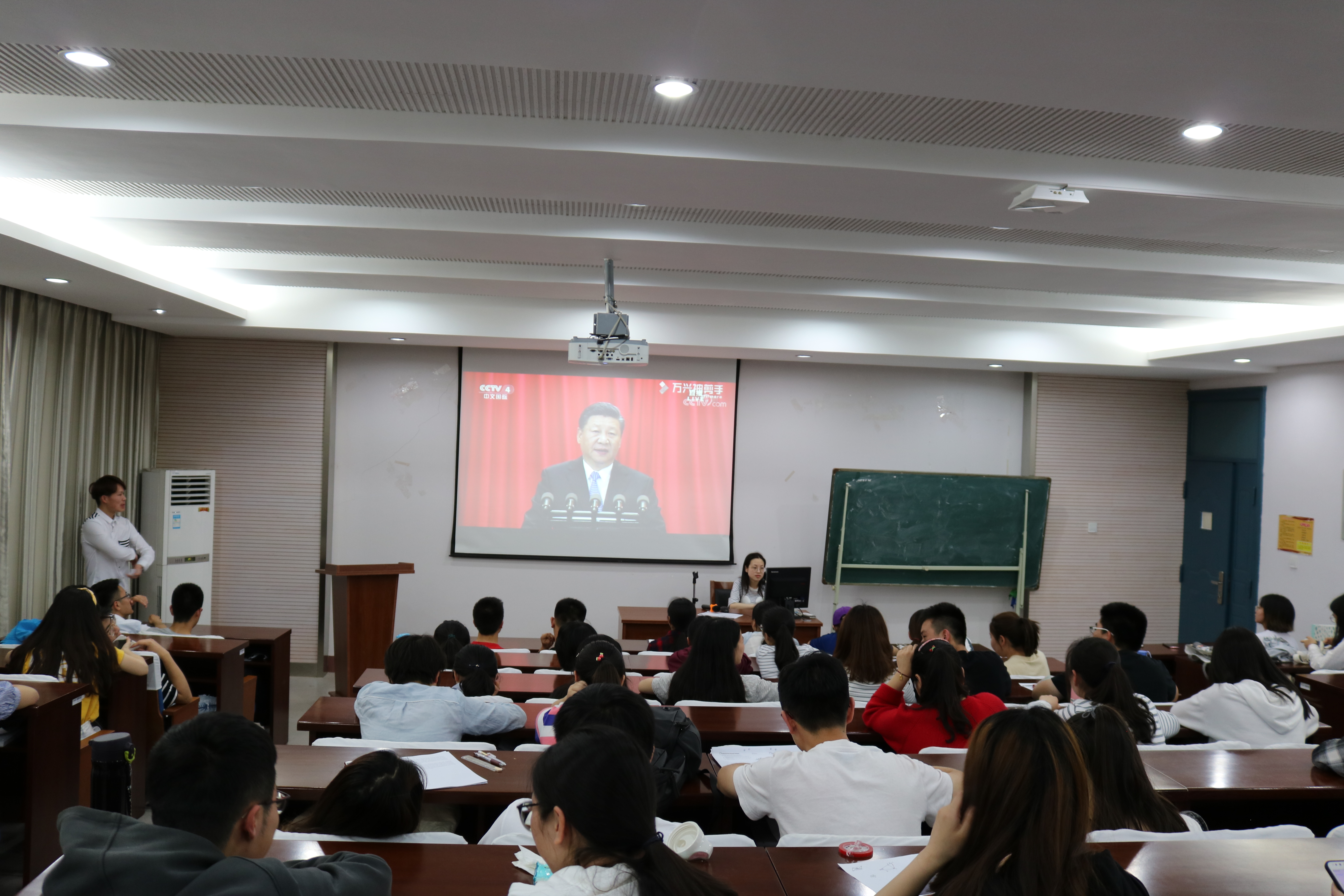 本次活动分为观看“纪念马克思诞200周年大会”盛况回播、“故事传子津,红色满商院——红色故事分享”、“热点新闻讨论”、“宣誓活动”四个模块。活动开始时,同学们集体观看了“纪念马克思诞辰200周年”习总书记重要讲话,同学们纷纷表示要遵从习总书记教导:“坚持在改革中守正出新、不断超越自己,在开放中博采众长、不断完善自己”。红色讲解团的代表沈丛政、倪静逸同学向大家分享了《南通老人——吴锦泉》、《我的舅公》等红色故事,分享了老同志们的无私奉献精神。活动中,同学们就“两会的召开”和“中国军队的改革目标”两个新闻点展开交流,通过相互讨论,纷纷举手踊跃发言表达自己的观点。