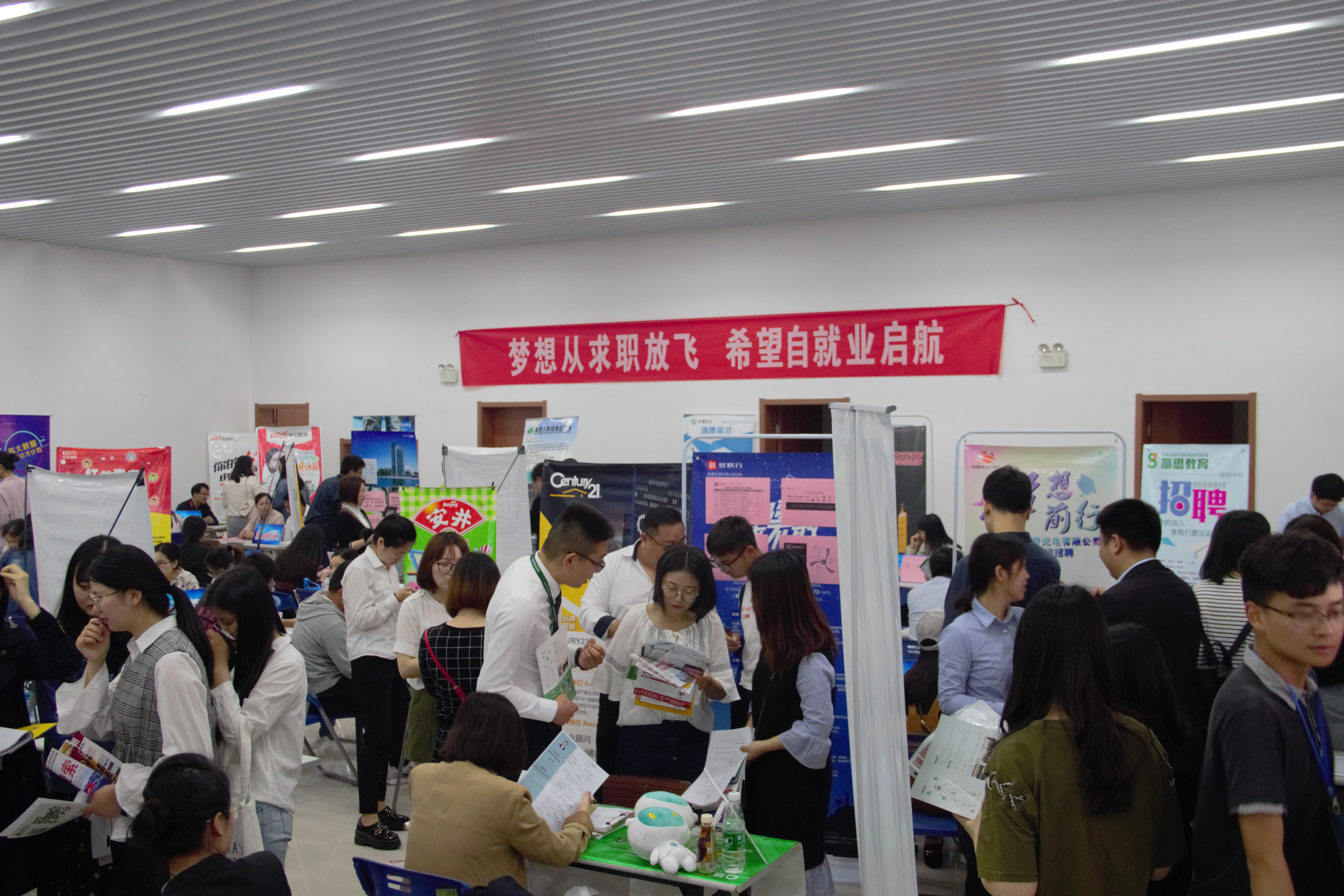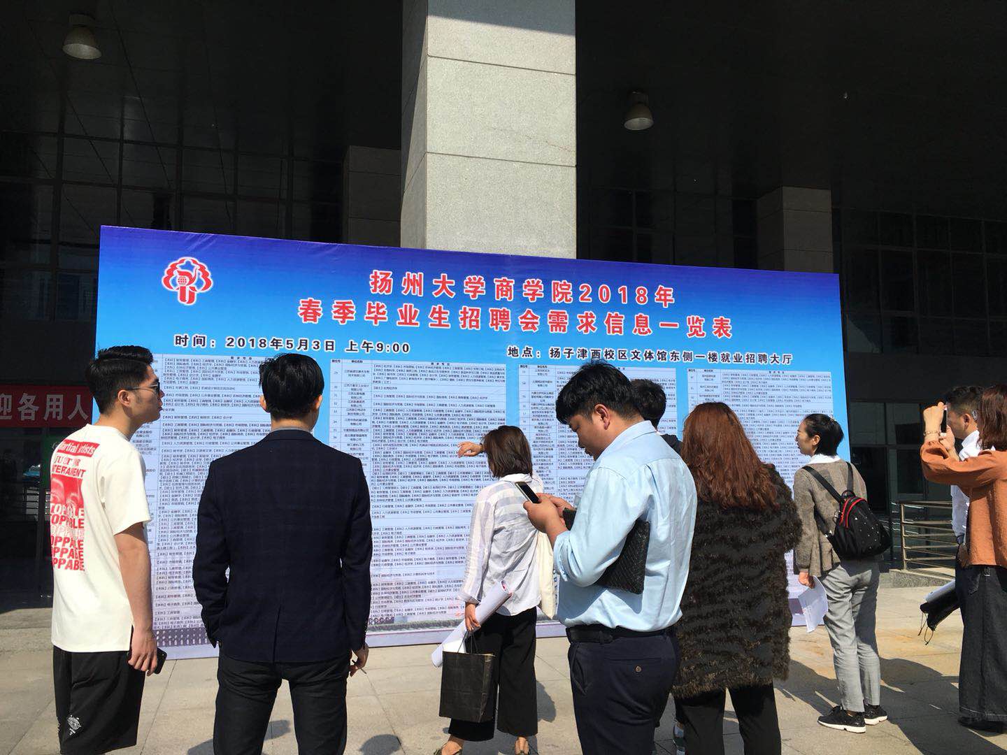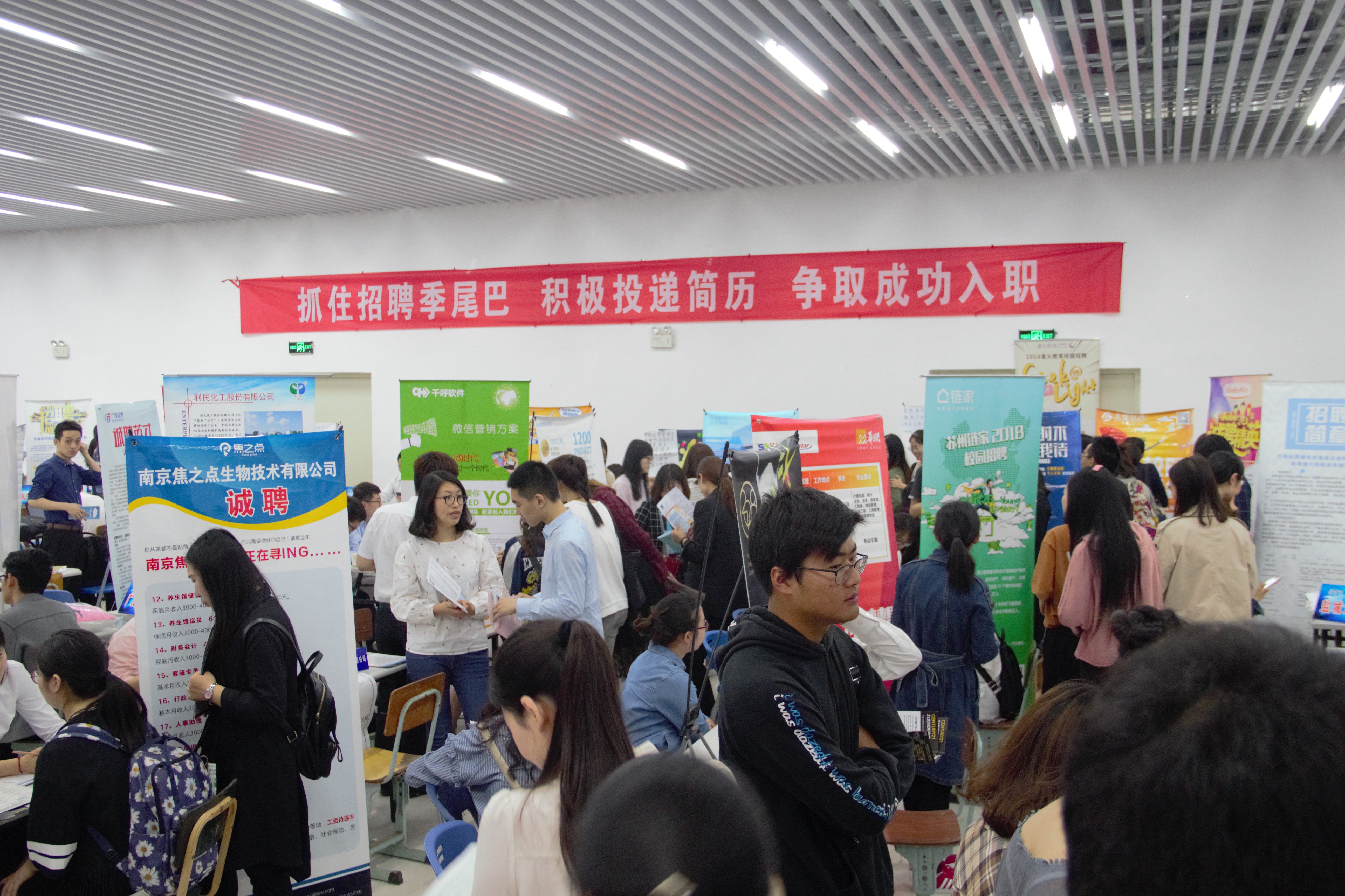 5月3日上午九点至十二点,扬州大学商学院2018届春季毕业生专场招聘会在扬州大学扬子津校区文体馆举行,此次招聘会共有一百多家企业到场。