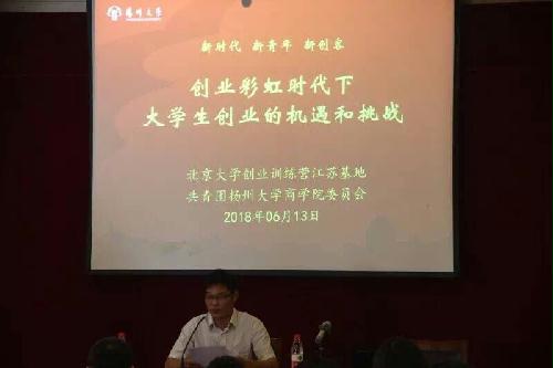 2018年6月13日下午,我院于行政楼一楼报告厅举办了“新时代新青年 新创客;创业彩虹时代下大学生创业的机遇和挑战”创新创业主题系列讲座 ,到会演讲嘉宾有北京大学创业训练营联合创始人姜英伟、扬州抱朴自然农业技术有限公CEO顾晔等,我院创客精英训练营全体学员参加此次培训。