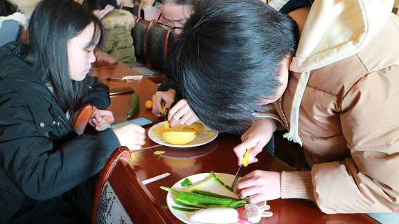 创新拼盘团队选手自备水果和蔬菜,现场规定时间内进行拼摆,按照抽签形式选定主题,进行拼盘比赛并为此讲述一段故事。参赛小组成员们分工合作,有的切水果,有的负责拼盘,各司其职,井井有条。各组都认真地比赛,食材多的小组也会和食材少的小组一起分享水果。在比赛中,大家都充分调动了自己的积极性,一起合力完成拼盘。