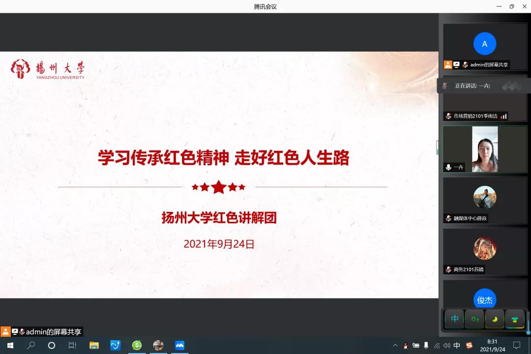 9月24日上午八点半,扬州大学商学院红色讲解团通过腾讯会议成功开展了“学习传承红色精神,走好红色人生路”线上会议。参加本次会议的人有辅导员张一卉老师、党员代表以及商学院21级全体新生。