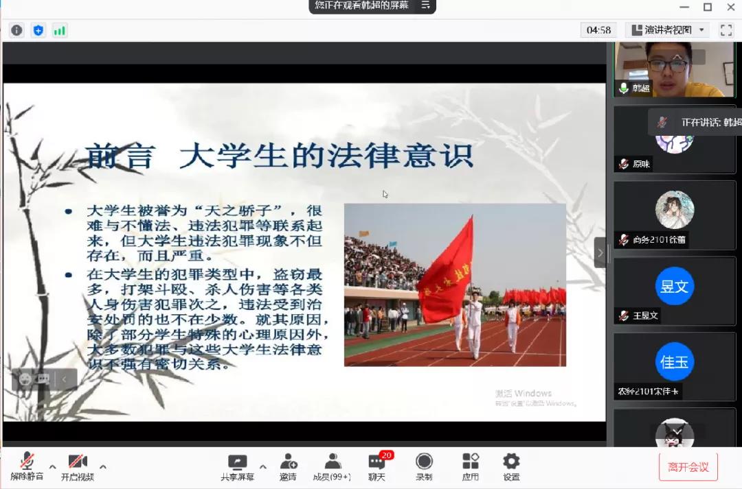 10月13日上午九点,扬州大学商学院通过腾讯会议的形式于线上成功举办了新生安全教育云端会议。参加本次会议的人有辅导员韩超老师、21级全体新生。