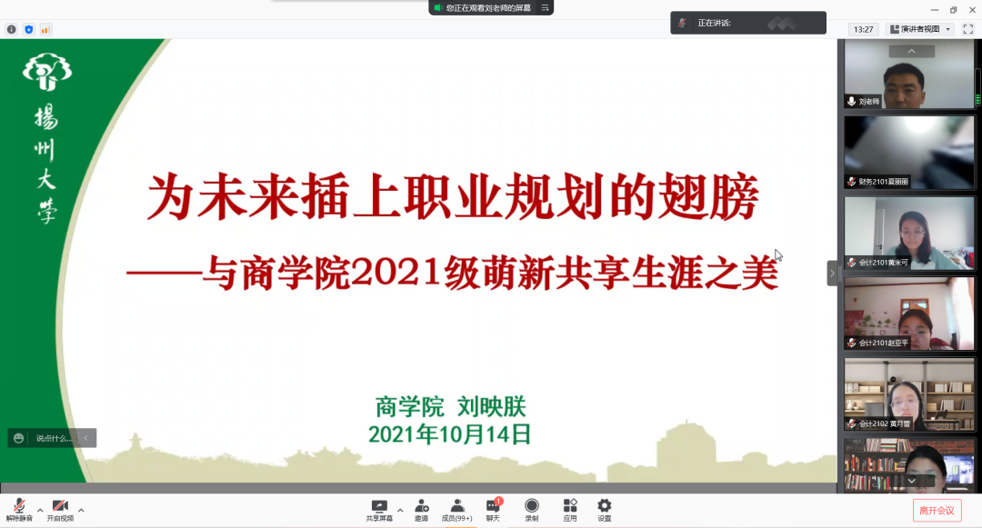 10月14日下午二点三十分,商学院成功举办“绘”商讲堂 “职”赢未来 三涯规划教育主题讲座,参与本次讲座的有辅导员刘映朕老师以及21级全体新生。