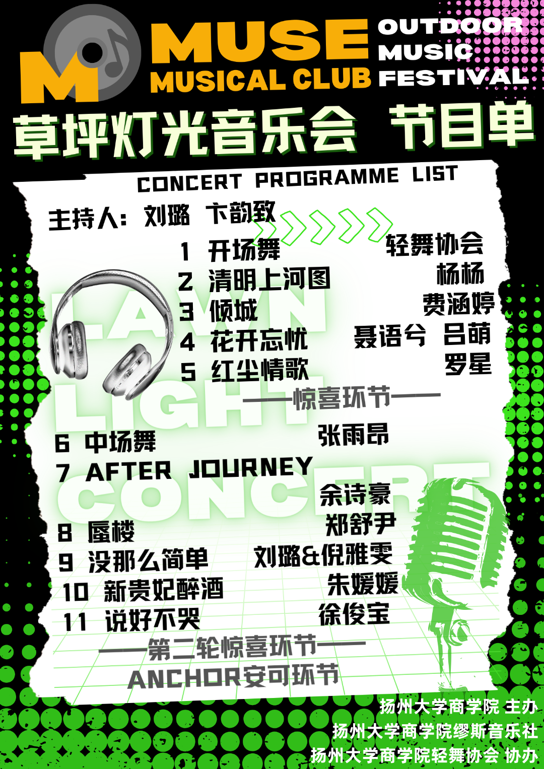 本次缪斯音乐社草坪灯光音乐会以其匠心独运的场景设计与深入人心的互动体验,为各位观众带来流行,古风等等风格的歌曲,将宁静的草坪化为各位歌手表达自我的舞台。歌手们的每一个音符,每一曲旋律,都将现场气氛推向高潮,让每一个在场者仿佛置身于音乐与星光编织的梦境之中。每个人的参与痕迹都成为音乐会不可或缺的一部分,赋予了这场活动更深的情感共鸣与集体记忆。