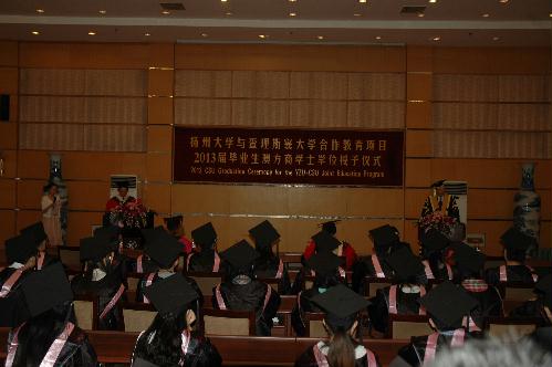 学位授予仪式在中华人民共和国国歌和澳大利亚国歌声中正式开始。典礼首先由商学院院长蒋乃华教授致辞,他向远道而来的客人及学生家长表示了欢迎,并向获得澳方商学士学位的同学们表示祝贺,勉励大家志存高远、坦诚待人、永远自信。随后,澳大利亚查尔斯特大学校长Lawrence Willett先生发表了热情洋溢的讲话。他表达了对2013届毕业生良好的祝愿,对两校合作办学的良好发展充满信心。