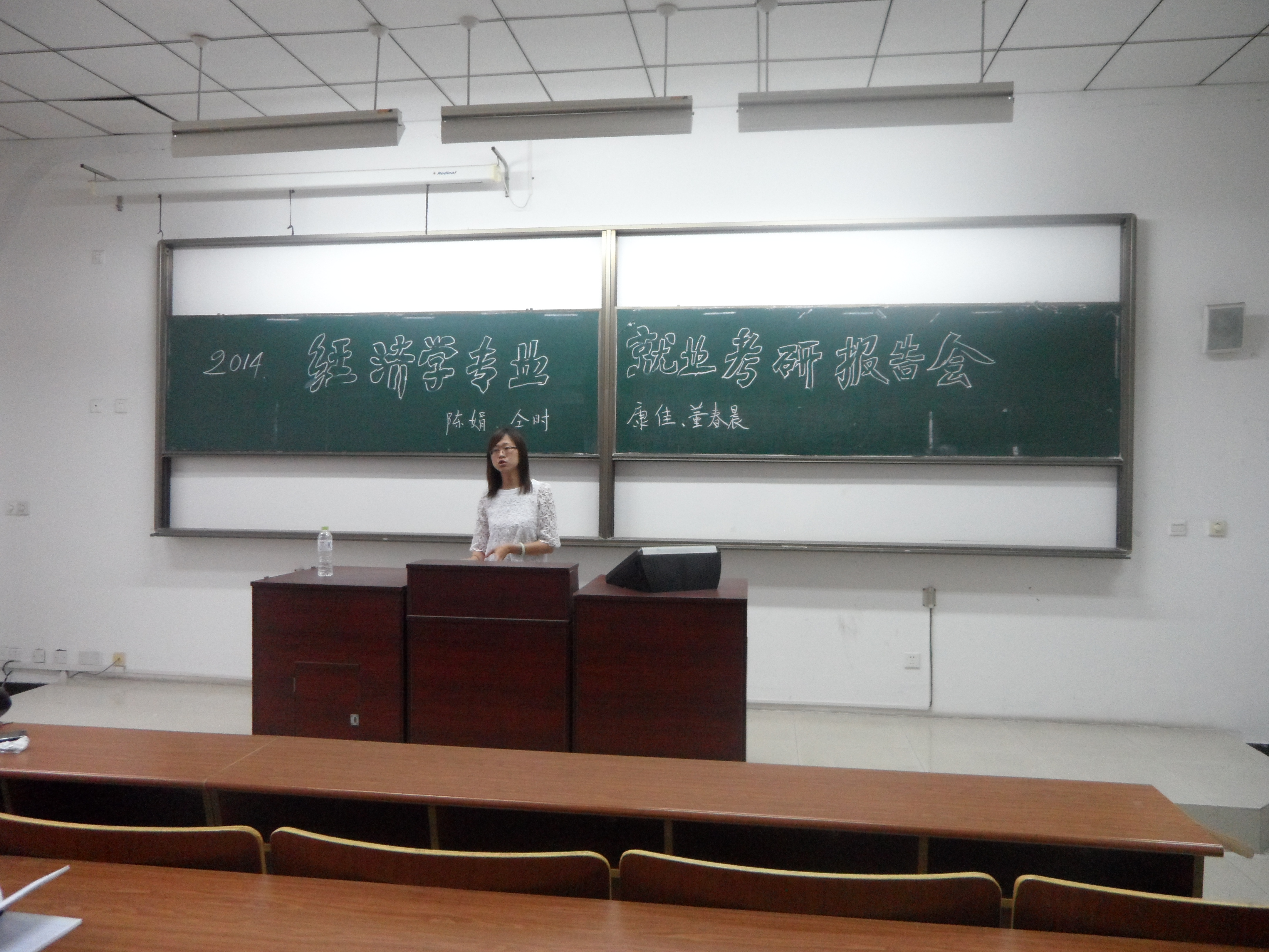 2014年6月16日下午,经济学专业邀请了毕业班的陈娟、仝时、康佳和董春晨等四位同学,为经济11级和12级全体同学,作了关于就业、考研和公务员国考的经验报告。四位同学分别就自己的经历从就业、考研和公务员考试等不同方面,与同学们分享了他们的经验和教训,并且提出了中肯的建议。时间虽然短暂,但重点突出,同学们都受益匪浅。