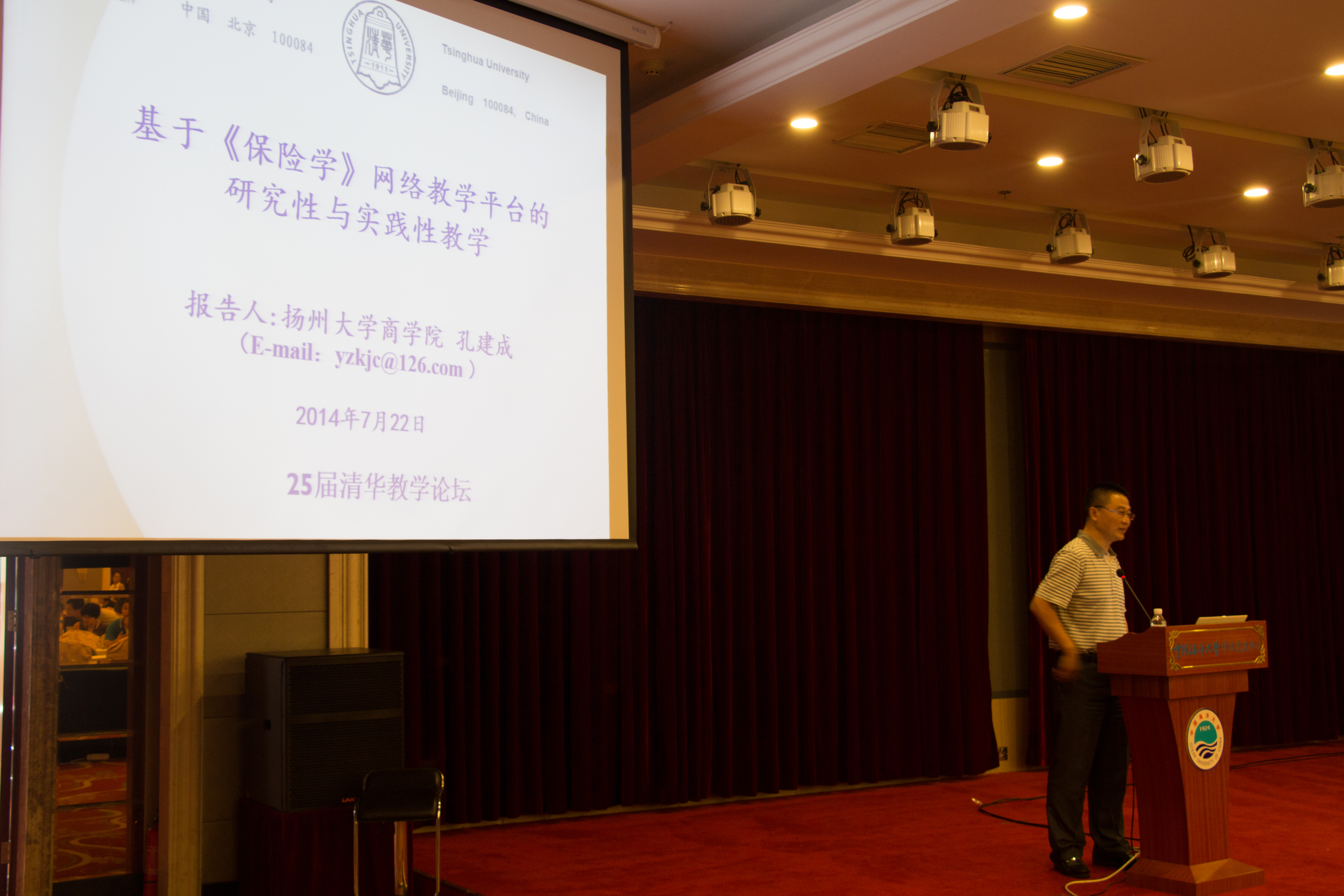 由清华大学与中国海洋大学联合举办的“第二十五届清华教育信息化论坛”于2014年7月22日在青岛圆满落幕。本届会议以“在线教育促进教育教学综合改革”为主题,从教育理论体系、技术体系、组织体系等多重视角,深入研讨了本科和职业院校开展在线教育、促进教育教学综合改革的策略和方法。来自全国84所院校154位代表出席了会议,其中包括主管教学及信息化建设的校长14位,教务处、网络中心、现教中心、信息化办公室和学校院系的相关负责老师140位。扬州大学商学院孔建成老师作为唯一的一线教师代表应邀在论坛上做“基于《保险学》网络教学平台的研究性教学和实践性教学”主题报告。