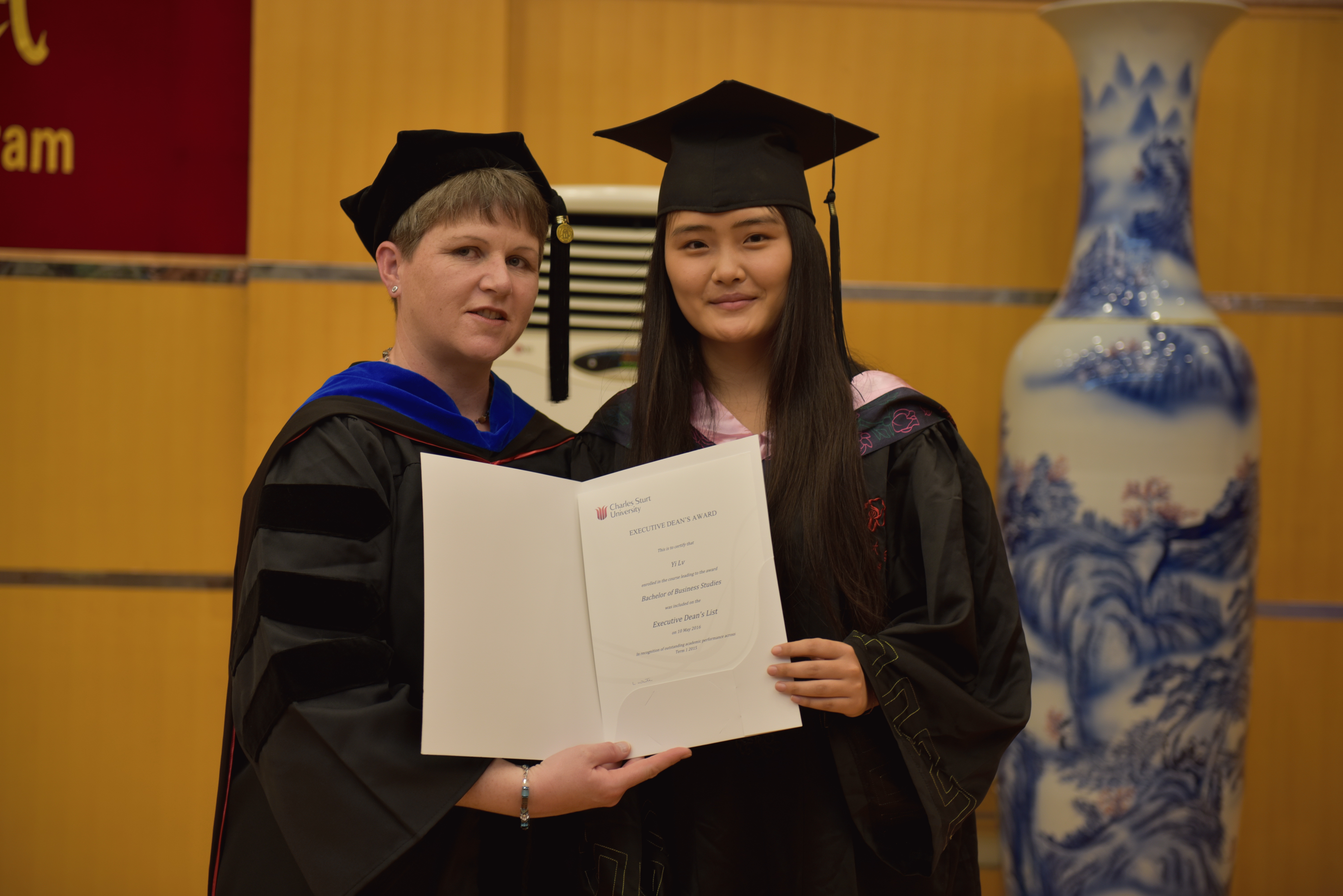 在庄严的乐曲声中,副校长Mary Kelly教授、副校长Heather Cavanagh教授共同为获得商学士学位的毕业生颁发了学位证书。刘洋洋和吕懿两位同学因为成绩优异,被澳方授予院长奖。毕业生代表刘洋洋同学回忆了大学四年与同学、老师朝夕相处的点点滴滴,并表示一定不辜负学校领导、老师的期望,牢记校训,做一名合格的毕业生,为母校争光。