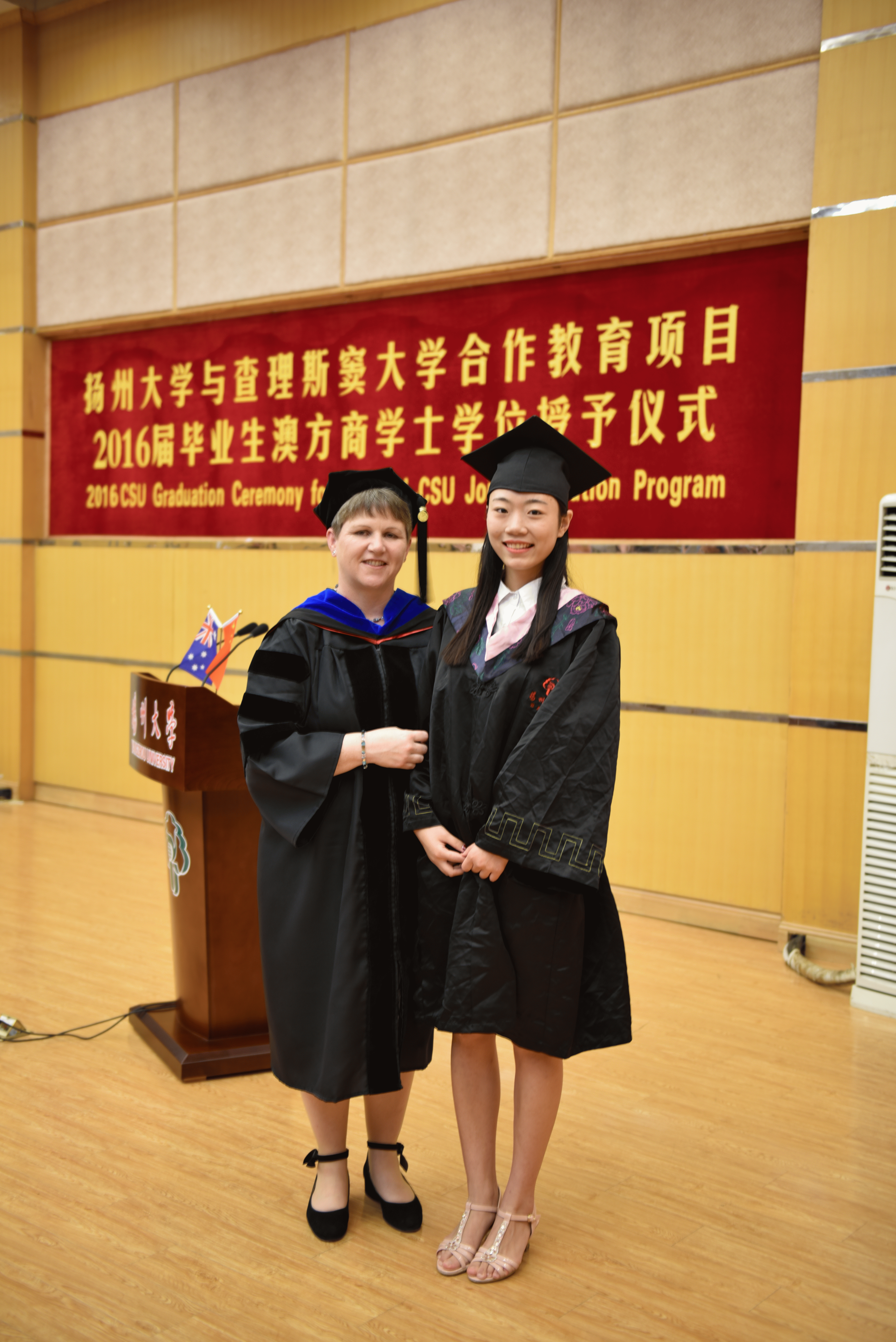 典礼首先由澳大利亚查尔斯特大学副校长Mary Kelly教授代表澳方校长致辞。她表达了自己对2016届毕业生的良好祝愿,鼓励大家用所学到的专业知识投身于社会,为国家作贡献。之后,商学院院长谢科进教授在典礼上讲话。他向远道而来的客人及学生家长表示欢迎,对获得澳方商学士学位的同学们致以祝贺。同时鼓励大家坚持梦想,保持自信,不断地学习和创新。