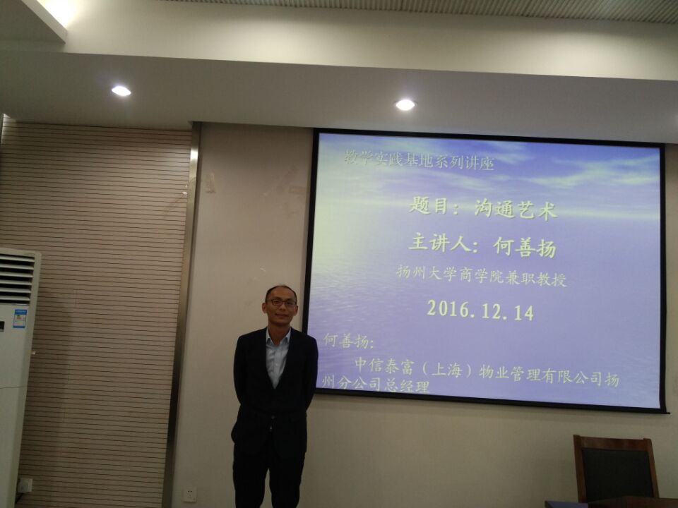 12月14日,公共管理专业邀请到教学实践基地的领导,中信泰富(上海)物业管理有限公司扬州分公司总经理何善扬先生为行政管理和公共事业管理专业的学生进行了一场讲座。何先生以《沟通艺术》为讲授的主题,结合自身管理的实际,深入浅出为学生解读了沟通在处理公司与客户关系过程中的重要性,并以典型案例为学生示范了如何进行有效沟通,讲座的现场不时传出阵阵的笑声。轻松的时刻时间总是过得很快,一个半小时的讲座让人意犹未尽。公管专业教学主任崔金云老师为讲座进行了的点评。何善扬先生不仅是一名成功的企业管理人士,也是一位关心教育发展的爱心人士。自校企合作以来,多次接受专业学生实践实习,更是受聘为扬州大学商学院兼职教授在百忙之中亲自为学生授课。期待校企合作更上一层楼,结出更多硕果。