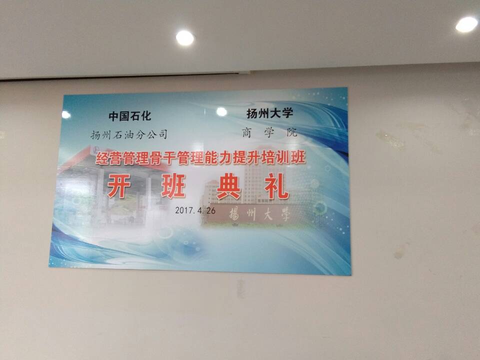 中国石化扬州石油分公司委托我院举办的“中国石化扬州石油分公司经营管理骨干管理能力提升培训班”,4月26日在我院正式开班。开班典礼上,卢彪院长代表学院致欢迎词,扬州石油分公司童广发书记作了开班动员并提出了具体要求。