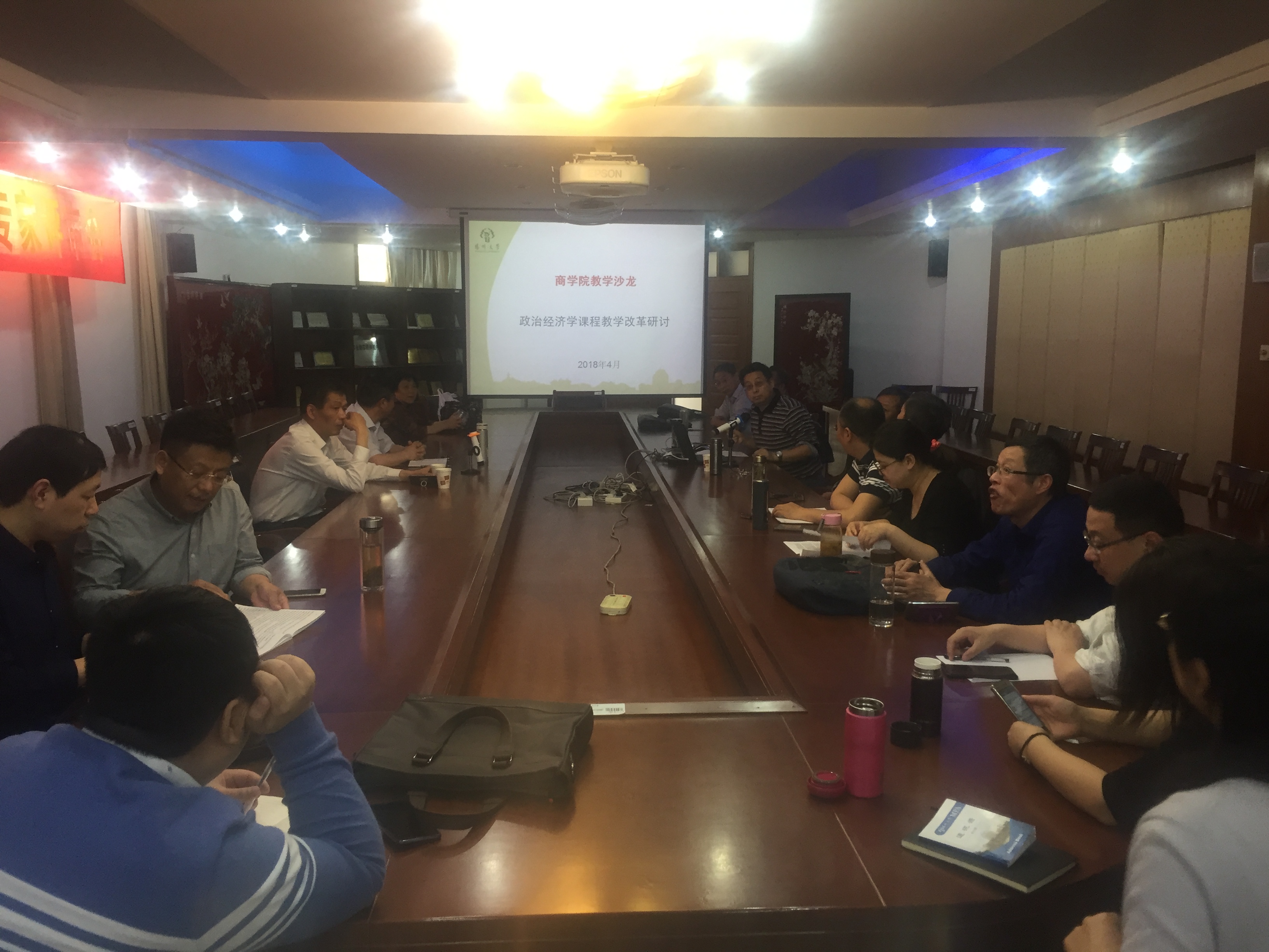 4月18日下午,商学院举办系列教学沙龙活动。本次活动主题为《政治经济学》课程教学改革研讨。首先由《政治经济学》课程带头人秦兴方处长分享了最近在复旦大学参加的全国政治经济学研讨会的情况,对新时代下如何上好《政治经济学》这门课程作出了总体要求。接下来由李春来老师和顾丽娟老师结合今年寒假参加的全国政治经济学骨干教师研修班的情况给大家报告了参会学习的内容和体会,随后政治经济学专业的所有老师根据自己的多年教学体会和经验深入展开了热烈讨论。最后,徐金海副院长从教学内容、教学方法、《政治经济学》与《西方经济学》之间的关系等方面对《政治经济学》的教学改革提出了新的要求,为《政治经济学》专业和课程建设指明了努力的方向。这次教学沙龙由经济学教研室承办,谭洪波副主任主持,全体经济学教研室老师参加了研讨。