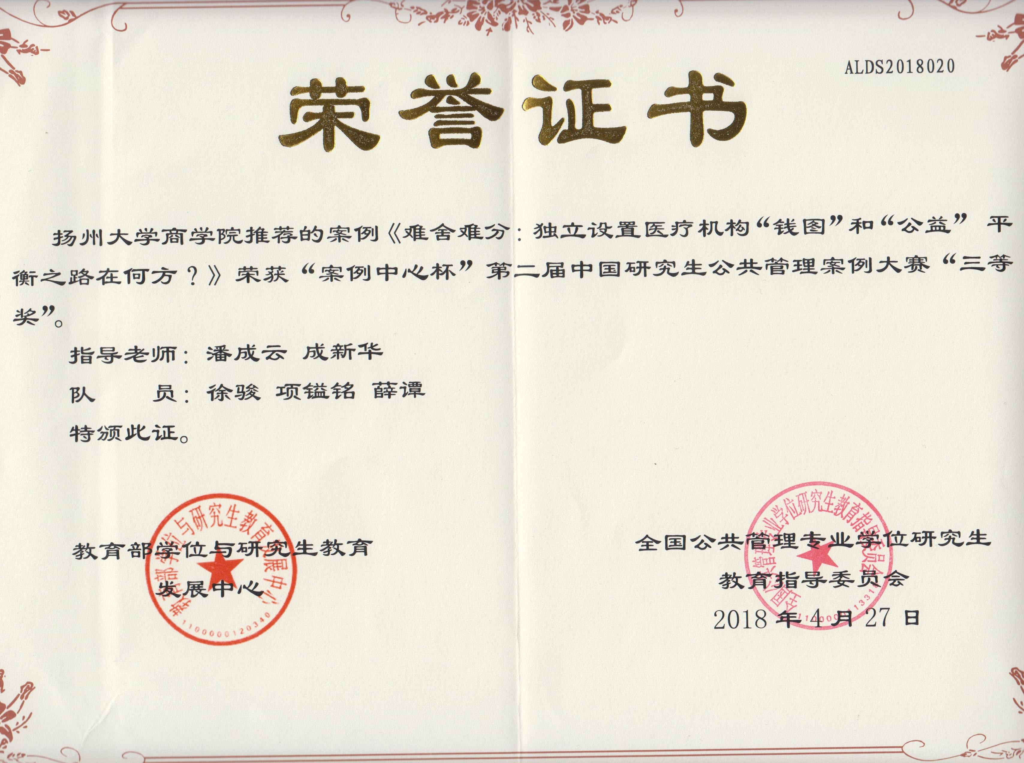 由我院2017级MPA学员徐骏、项镒铭、薛谭组成的代表队在潘成云教授、成新华教授指导下,对于扬泰地区独立设置医疗机构的案例进行了分析和研究,多次赴相关医疗机构进行实地调研,完成了题为《难舍难分:独立设置医疗机构“钱图”和“公益”平衡之路在何方?》的案例报告,从全国1091支参赛队伍中脱颖而出,晋级全国32强,荣获三等奖。