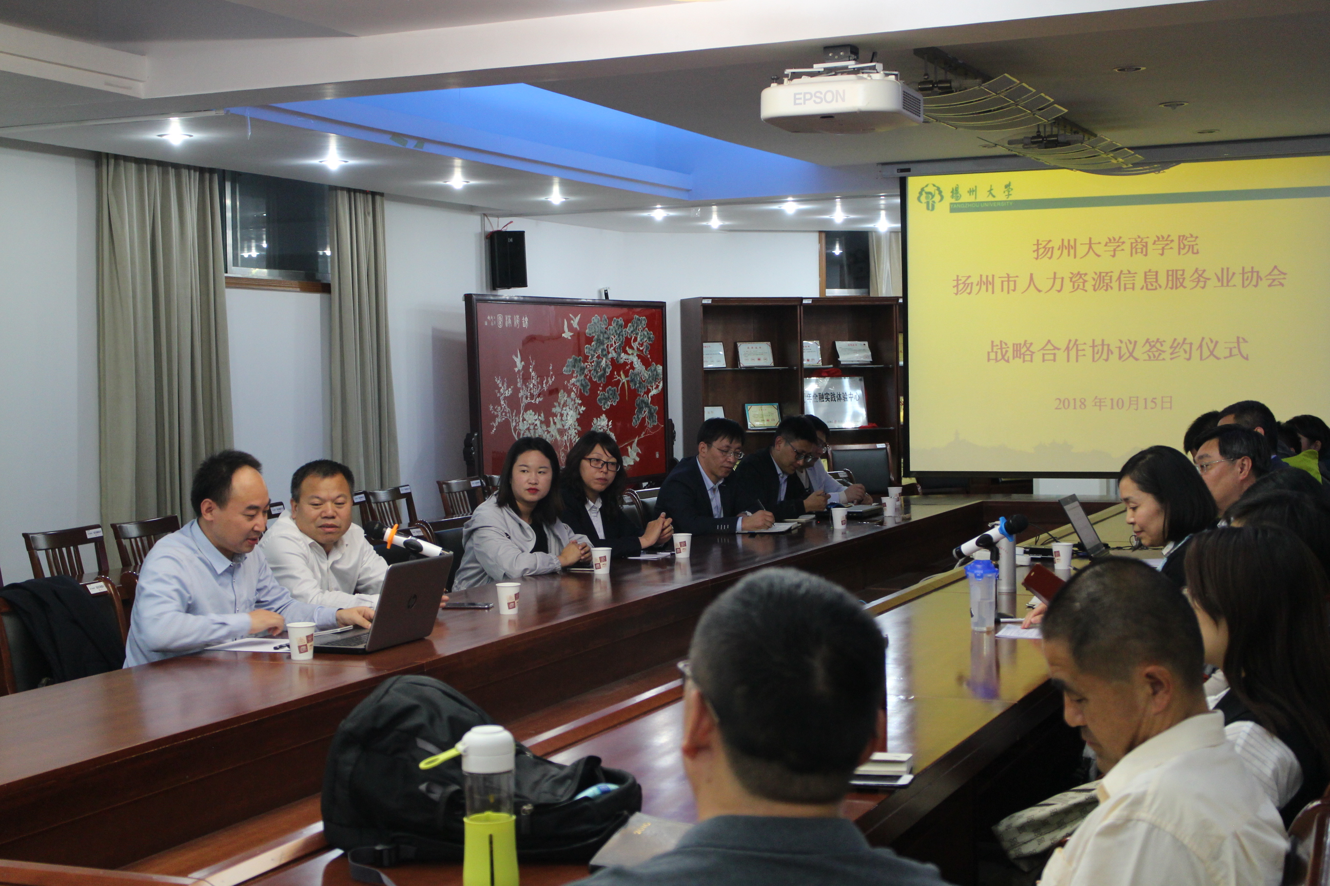 随后,徐金海副院长与扬州市人力资源信息服务业协会常务副会长王晓晴先生共同签署了共建战略合作协议。双方秉持共赢理念,优势互补,资源共享,共同致力于构建“大人才+大平台+大数据+大服务”体系。扬州大学商学院-北森人力资源测评与研究中心致力于加速推进高层次、高技术含量、高附加值的现代人力资源服务,打造一站式、一体化、全链式的人力资源服务平台,提供专业化、定制化、体系化的人力资源服务;扬州市人力资源信息服务业协会在信息推广、信息交流、人员交流等方面发挥协会的优势和提供相关便利,双方同意互为合作事项创造最惠条件和待遇,共同形成新的发展优势。