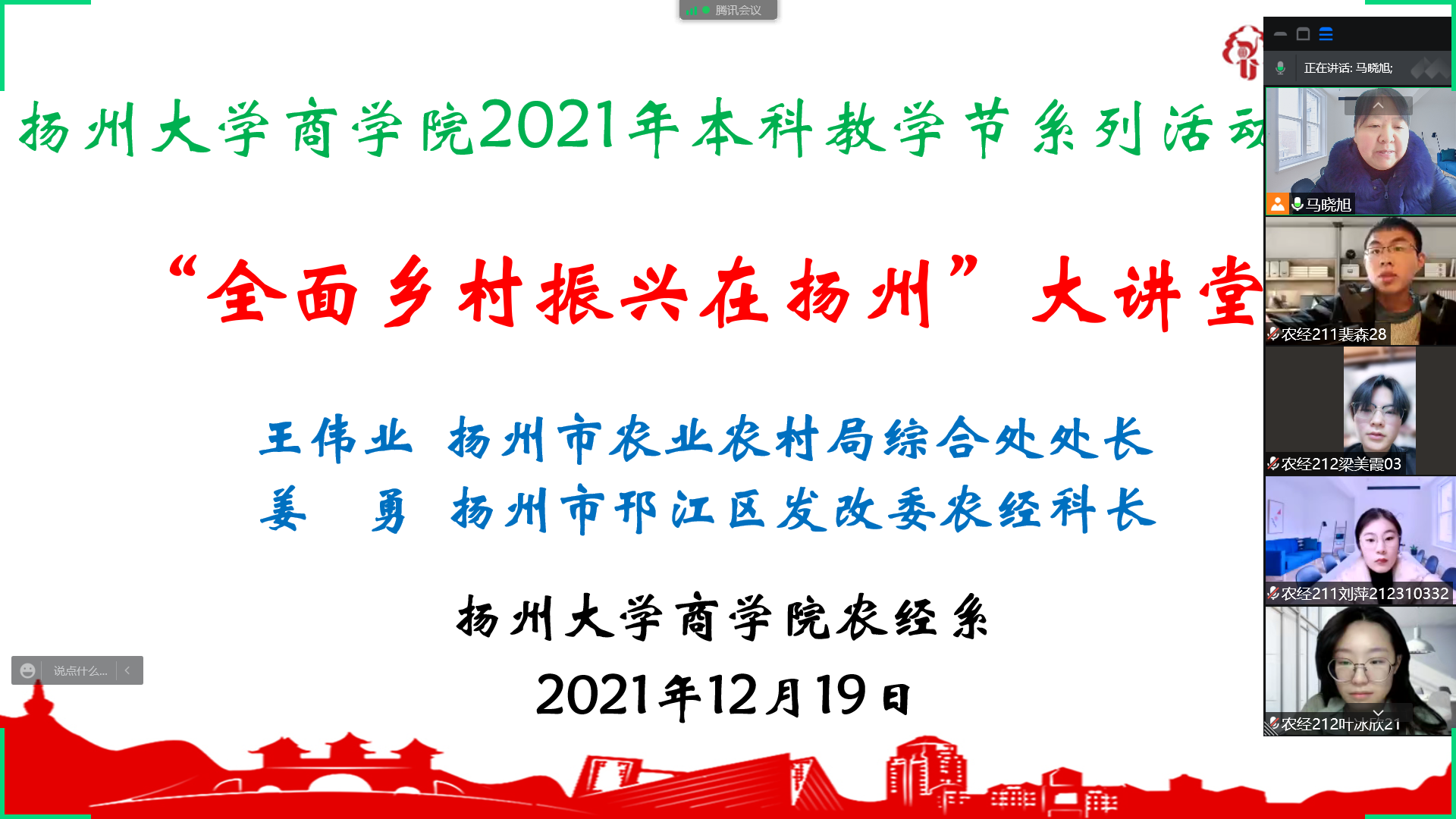 为响应扬州大学2021年本科教学节系列活动,商学院农经系于2021年12月19日上午开展了题为《全面乡村振兴在扬州》的线上教学实习活动,农经211、212的全体同学与相关教师参加了本次活动。
