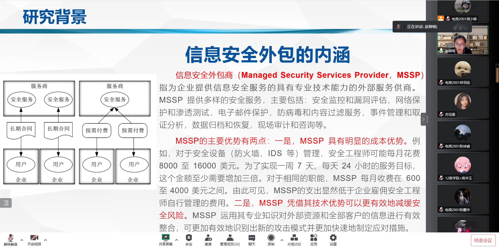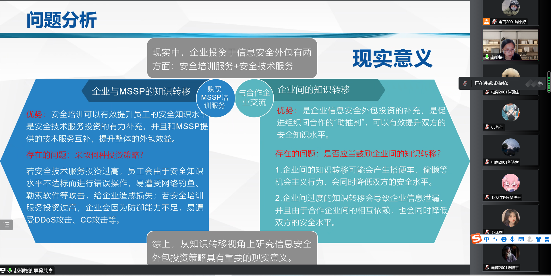 此次以《信息安全外包投资策略:知识转移视角》为主题的线上讲座的开展,使同学们对信息安全外包有了更深层次的了解,同时学习到在知识转移视角上研究信息安全外包投资策略更具有意义。此外,在赵柳榕副教授循序渐进的讲解下,同学们更加清楚地掌握课题的研究框架。