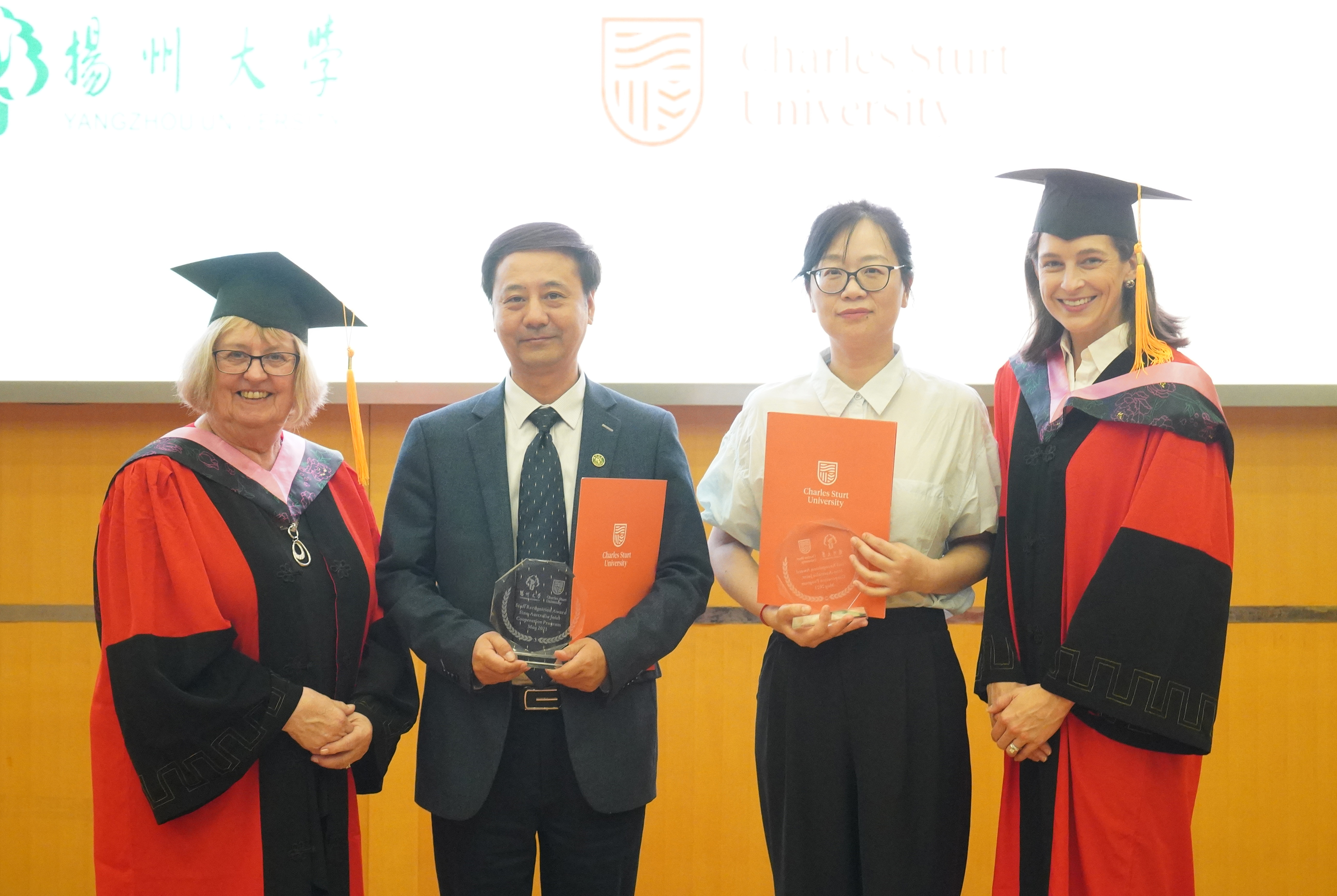 澳方学位授予仪式在庄严的两国国歌声中拉开序幕。商学院院长李志斌教授,商业、司法和行为科学学院执行副院长Jenny Kent副教授分别代表两校致辞。Eleanor Mitchell主任和Jenny Kent副院长共同为获得澳方学位的毕业生颁发证书。为表彰在合作办学工作中做出突出贡献的中方教师,查尔斯特大学设立了优秀教师奖和优秀管理奖。澳方来宾为2023年度获得表彰的李焕彰和缪海涛两位老师颁奖。