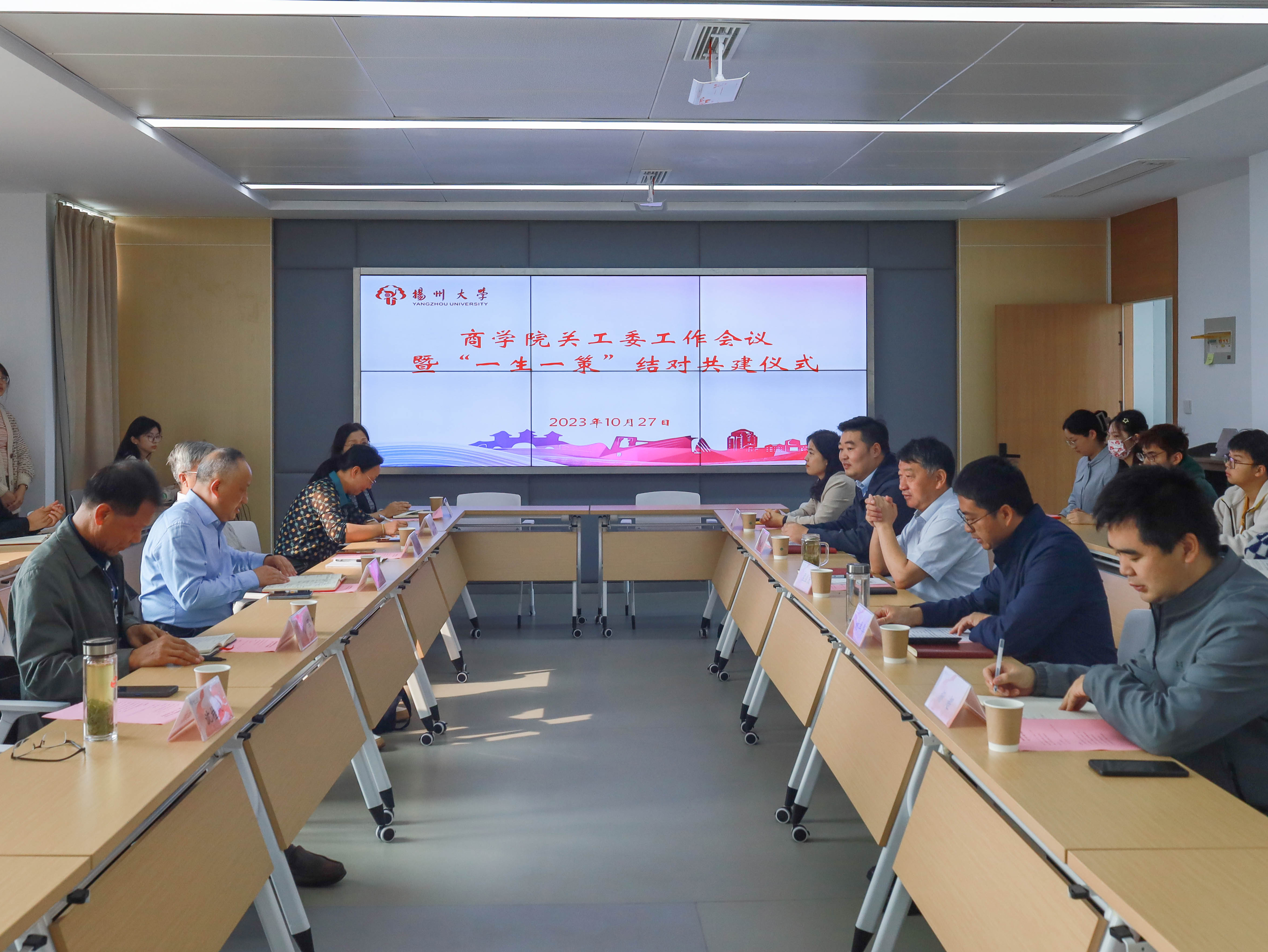 10月27日,商学院举办关工委工作会议暨“一生一策”结对共建仪式。校关工委办公室主任、副秘书长刘汉柏,校关工委执行秘书王琳,校关工委扬子津校区联络站主任刘军,院关工委老同志蒋建刚,院关工委老同志沈桂林,院关工委老同志施文洁,院党委书记孟益宏,院关工委成员和结对班级学生代表、结对学生出席本次会议。院党委副书记姚丰华主持会议。