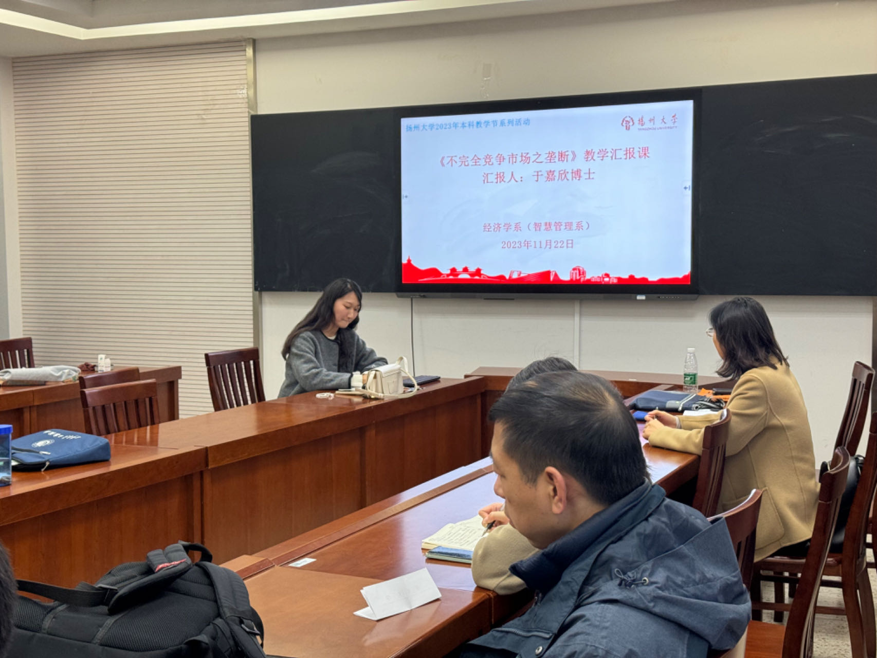 2023年11月22日下午,商学院经济学系(智慧管理系)在商学院MBA/MPA楼512会议室举办了扬州大学2023年本科教学节系列活动《“不完全竞争之垄断”微观经济学教学汇报课》。教学汇报课由于嘉欣博士主讲,从课程教学内容、教学设计、教学特色及思政元素融入等方面进行了汇报和分享。商学院原院长秦兴方教授、商学院徐静副院长、朱高林教授、高功步教授及其他老师分别从如何导入教学内容、如何选择思政元素、如何选择教学案例及如何进行板书设计等方面进行了深入的研讨。本次教学汇报课是《微观经济学》卓越课程建设的重要内容,旨在深化经济学国家级一流专业的建设,通过微观经济学课程教学内容、教学案例及思政元素等方面的深入交流和研讨,极大地提升了经济学系(智慧管理系)青年教师的教育教学能力。