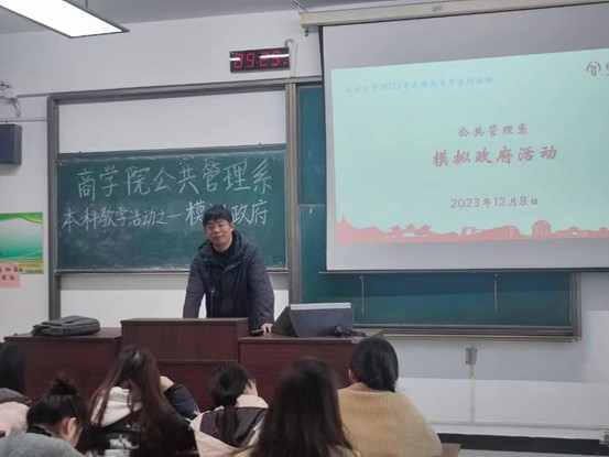三是搞一次模拟(政府)。12月10日,公管系在扬子津西校区2号教学楼210教室举办了“模拟政府活动”,行政2301班和行政2302班全体同学共同参与。通过问题背景介绍、模拟角色发言辩论、有奖竞猜、教师点评、投票表决等“情景式”教学环节,引导同学们主动增强对社会问题的关注,让同学们在“体验”中了解基层公共事务治理过程,增强同学们专业实操技能。