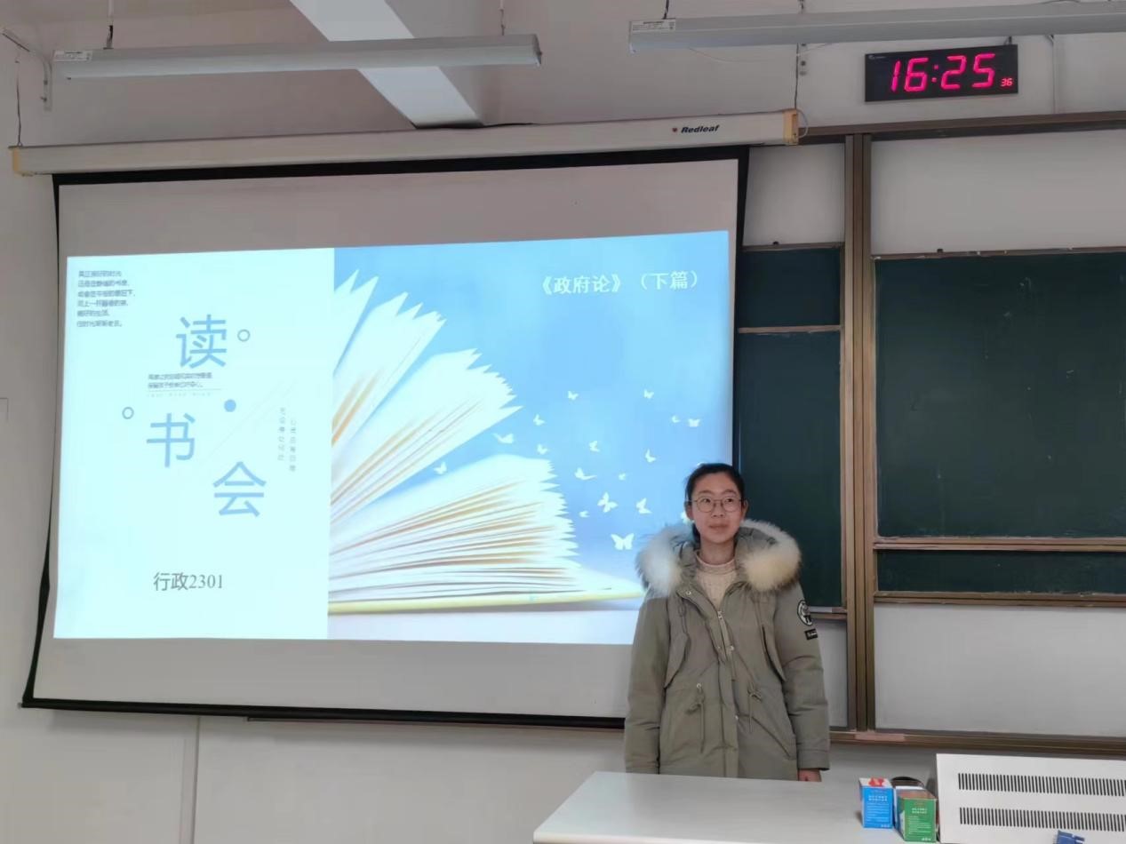 四是读一本好书。12月21日,行政2301班举行读书会活动,同学们通过同看一本好书并分组讨论汇报,逐一呈现各组对书中内容的理解,并就该书在当代的意义做了独到解读,让大家在交流中实现思想碰撞,在增加知识面的同时,加深对知识的理解和专业的认识。