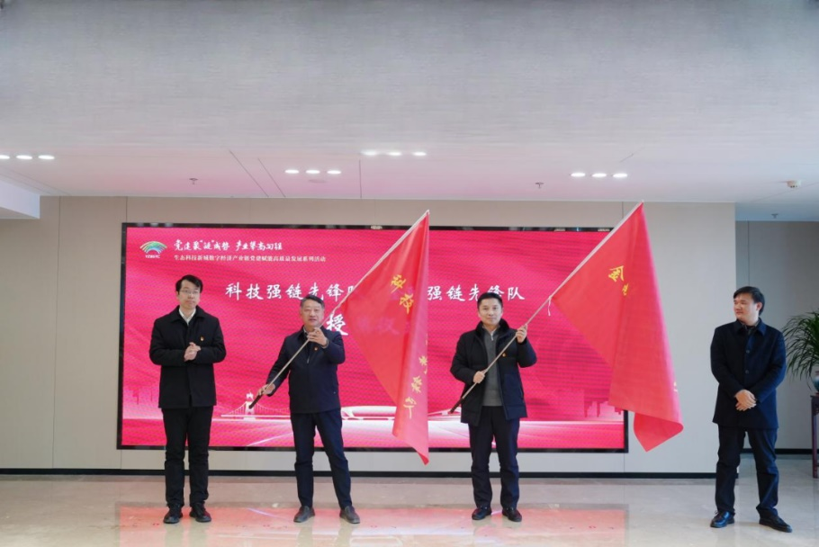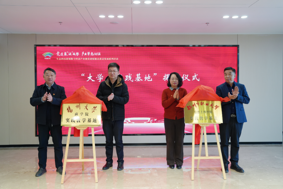 活动中,与会领导共同为“科技强链先锋队”“金融强链先锋队”授旗,向新城数字经济产业链成员单位颁发证书,“数字经济产业链共享中心”“扬州大学商学院实践教学基地”等基地揭牌。