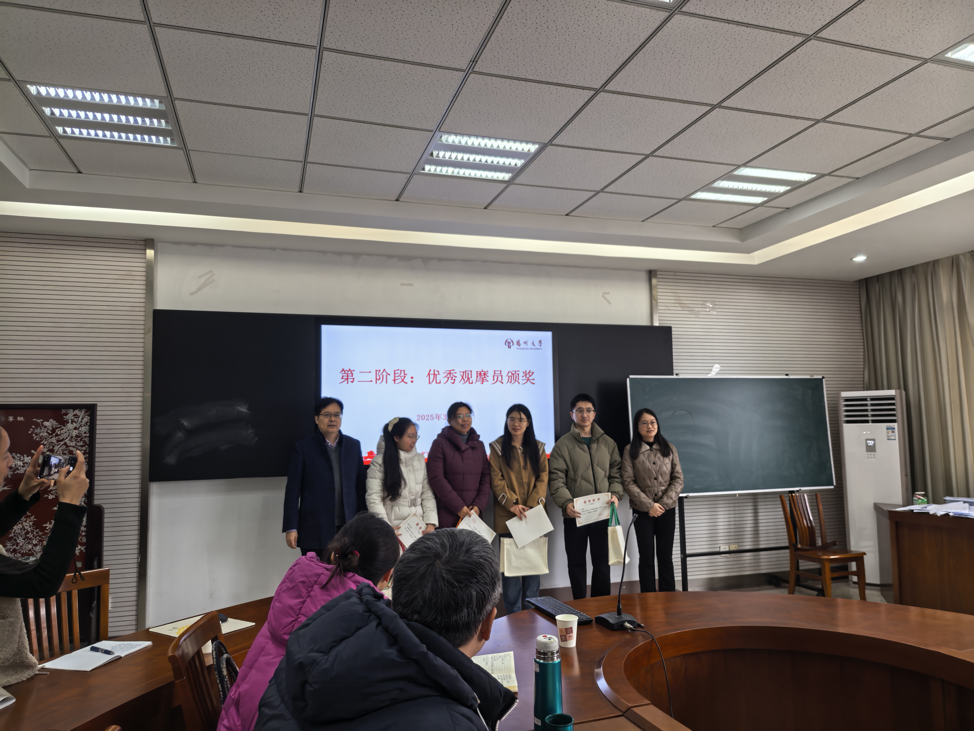 在会议第二阶段,优秀观摩员颁奖活动隆重举行。院长李志斌亲自为4位优秀观摩员颁发荣誉证书和奖品。在颁奖过程中,李志斌院长向他们表达了诚挚的祝贺,勉励在场的所有教师积极投身教学改革与创新,在未来的教学工作中争取赢得更多教学奖项,共同推动学院本科教学工作的进步。