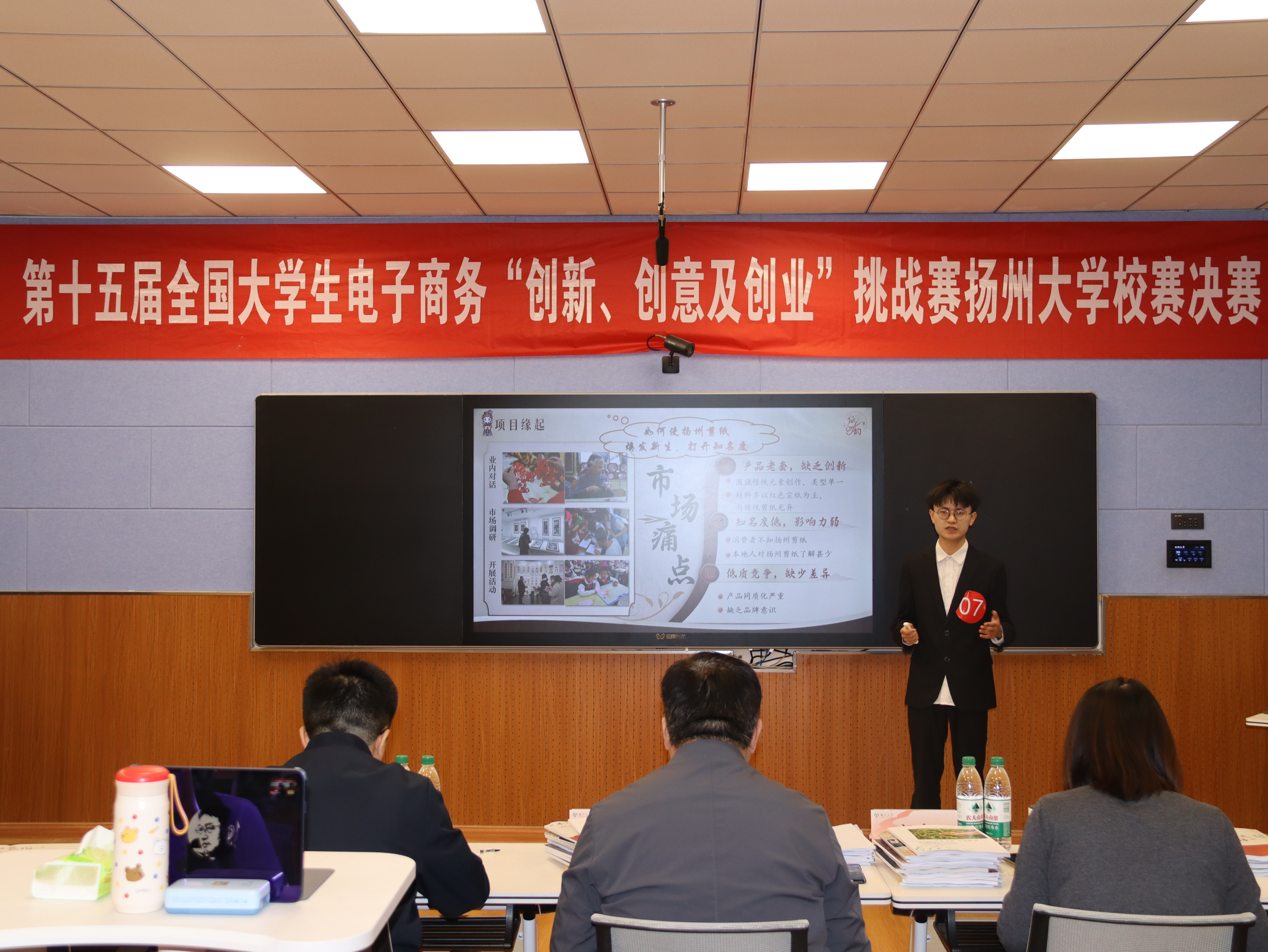 近日,扬州大学第十五届大学生电子商务“创新、创意及创业”挑战赛决赛在我院MBA楼二楼智慧教室式举办。本届赛事来自商学院、信息工程学院、新闻与传媒学院、环境科学与工程学院、机械学院等共100多支队伍报名参赛,经层层筛选,16支项目团队脱颖而出进入决赛。决赛以团队路演形式开展,融合实物模型、数据可视化分析与创新方案汇报。