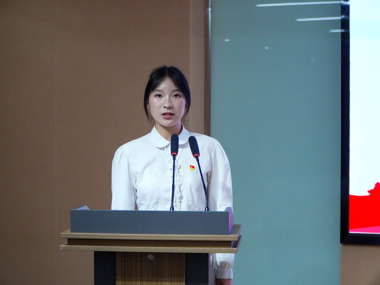 商务2202班诸悦作为新党员代表发言,她表示党员身份是责任更是使命,将从革命历史中汲取力量,以行动践行信仰,发挥先锋模范作用。入党积极分子代表、行政2302班邓朝鑫分享学习感悟,承诺以更高标准要求自己,争取早日入党。