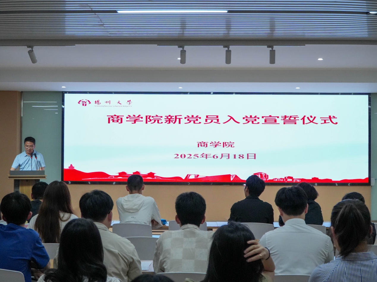 为强化党员身份认同与责任担当,6月18日,商学院在一楼报告厅举行新党员入党宣誓仪式。院党委书记孟益宏出席并讲话,院党委副书记姚丰华主持仪式,组织员卢炜、全体学生支部书记、2024年下半年及2025年上半年新党员、入党积极分子代表共同参与。